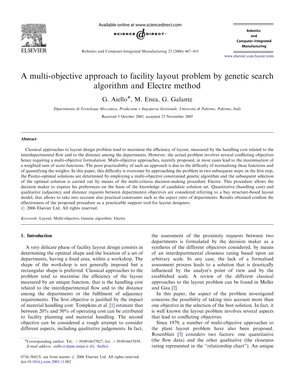 传统的解决布局设计问题的方法倾向于最大化布局的效率,一般靠计算设备间的流通量和各设备之间的距离决定。然而,实际的问题涉及多个相互冲突的目标,因此需要指定一个多目标的方法。最近提出,在大多数情况下,可以通过计算目标函数的加权和。这种方法的实用性差是量化这些功能权重的难度。在本文中,这个困难是由两个后续步骤逼近问题解决的:在第一步中,pereto最优解是通过使用一个多目标约束遗传算法和随后的选择决定最优解,这步是由多标准决策过程的Electre手段进行的。此过程允许决策者在候选解集的知识的基础上表现他的喜好。定量(物料搬运费用)和目标定性(设备之间的邻接和距离请求)被认为指的是基于结构布局的模式,即考虑实际限制,例如设备的纵横比。实验结果证实了此实行程序作为布局设计切实可行的辅助工具的有效性。