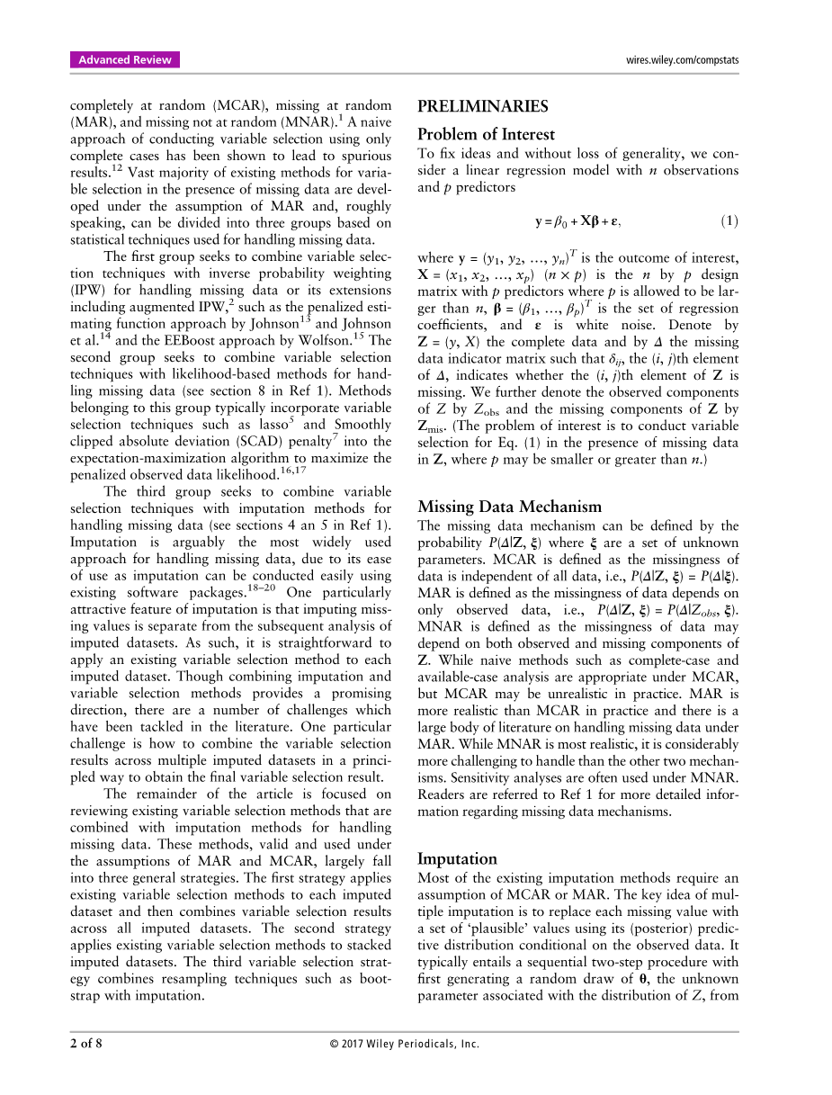 第三组试图将变量选择技术与插补方法结合起来处理缺失数据(见参考文献1第4节和第5节)。插补可以说是处理缺失数据最广泛使用的方法,因为插补很容易使用,因为插补可以很容易地使用现有软件包进行。插补的一个特别有吸引力的特征是插补缺失值与随后对插补数据集的分析是分开的。因此,将现有的变量选择方法应用于每个输入的数据集是很简单的。尽管插补法和变量选择法相结合提供了一个有前途的方向,但文献中仍有许多挑战。一个特别的挑战是如何将多个输入数据集的变量选择结果以一种原则性的方式组合起来,以获得最终的变量选择结果。