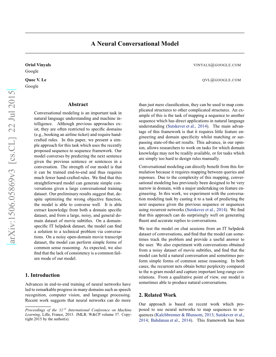 会话建模是自然语言理解和机器智能中的一项重要任务。尽管存在以前的方法,但它们往往局限于特定的领域(例如预订机票),需要手工制作的规则。在本文中,我们提出了一个简单的方法,它使用最近提出的序列来排序框架。我们的模型通过预测对话中前一句或前几句的下一句来进行对话。我们的模型的优点是可以进行端到端的训练,因此需要更少的手工规则。我们发现,给出了大量的会话训练数据集,这种简单的模型可以生成简单的会话。我们的初步结果表明,尽管优化错误的目标函数,该模型能够很好地进行转换。它能够从特定领域的数据集以及电影字幕的大型、嘈杂和通用领域的数据集中提取知识。在特定领域的IT服务台数据集上,该模型可以通过对话找到技术问题的解决方案。在嘈杂的开放域电影抄本数据集上,该模型可以执行简单形式的常识推理。正如预期的那样,我们还发现缺乏一致性是我们模型的常见故障模式。