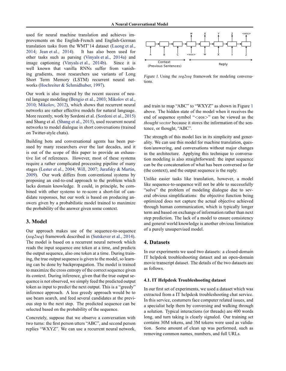我们的方法是基于最近的研究提出的序列到序列的神经网络模型。该框架已经被用于神经机器翻译,并实现了WMTrsquo;14数据集的英语-法语和英语-德语翻译任务的改进。它还被用于其他任务,如解析和图像字幕。众所周知,vanilla RNNs存在消失梯度,因此大多数研究人员使用长短期记忆(LSTM)递归神经网络的变体。我们的工作也受到最近成功的神经语言建模的启发,这表明递归神经网络对于自然语言来说是相当有效的模型。最近,索尔多尼等人使用递归神经网络对短对话中的对话进行建模(在Twitter风格的聊天中训练)。在过去的几十年里,许多研究人员一直在研究构建机器人和会话代理,提供详尽的参考列表超出了本文的范围。然而,大多数这些系统需要相当复杂的多阶段处理流水线。我们的工作不同于传统的系统,提出了一种端到端的方法来解决缺乏领域知识的问题。原则上,它可以与其他系统相结合,重新计算候选响应的简短列表,但是我们的工作是基于产生由概率模型给出的答案,该概率模型被训练为在给定的上下文中最大化答案的概率。