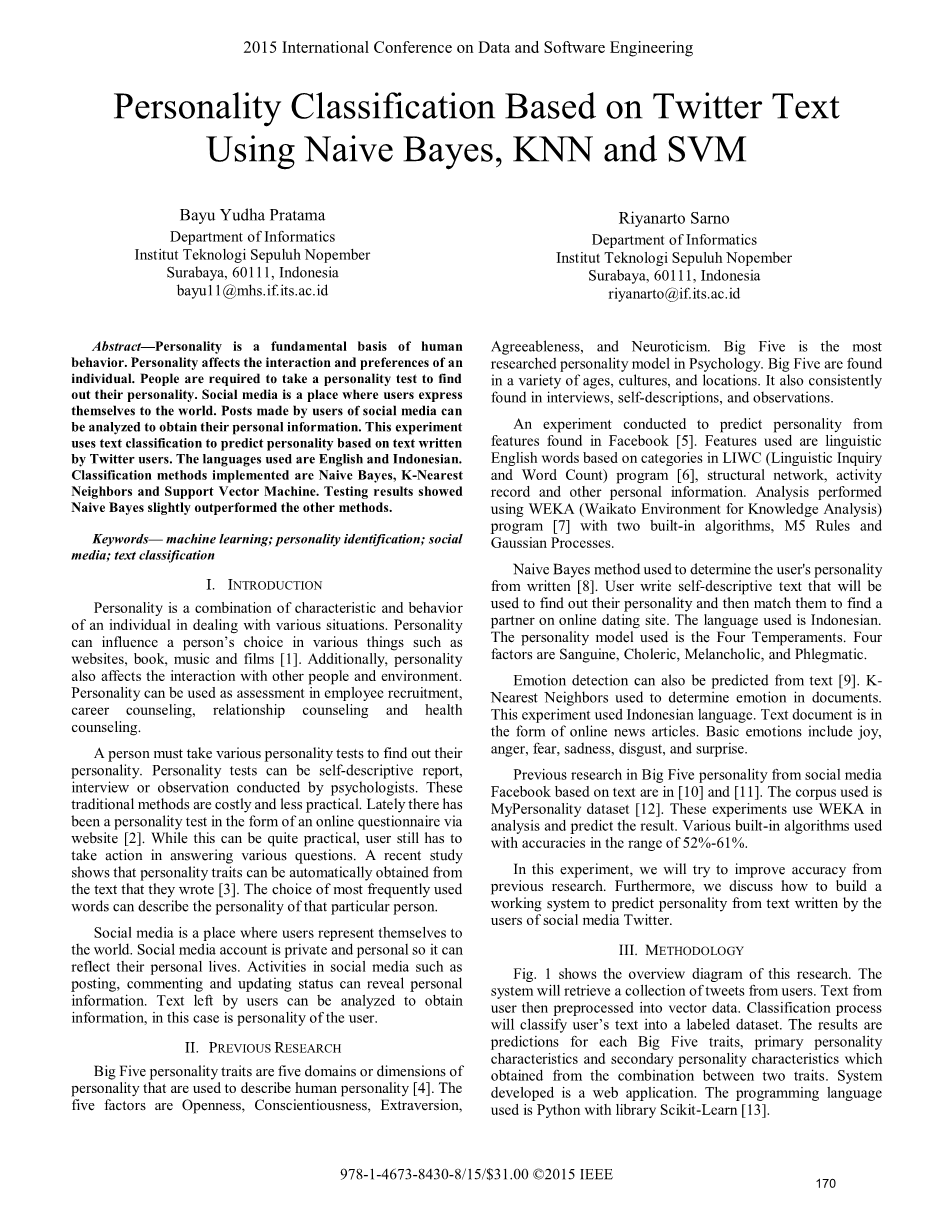 一个人必须通过各种性格测试来了解自己的性格。人格测试可以是心理学家进行的自我描述报告、访谈或观察。这些传统方法成本高,不太实用。最近,通过网站[2]进行了一项在线问卷形式的人格测试。虽然这是非常实际的,但用户仍然必须在回答各种问题时采取行动。最近的一项研究表明,个性特征可以从他们写的文本中自动获得[3]。选择最常用的词可以描述那个人的个性。