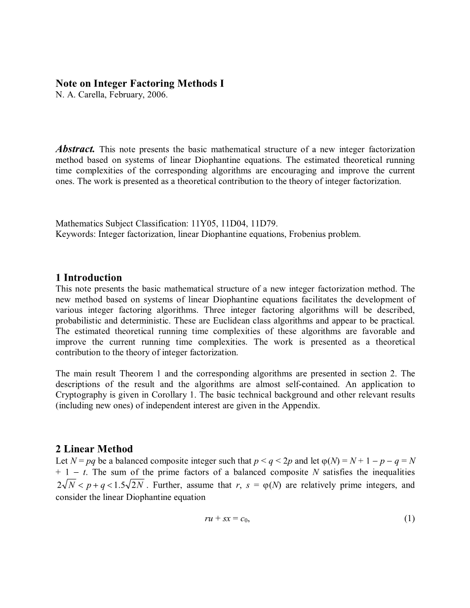 试除法是分解整数最简单的算法。假设s和t是N的重要因子,所以st=N并且sle;t。执行试除法算法,只是检查是否一个S是否能被N整除s = 2,hellip;, lfloor;radic;nrfloor;。当找到这样一个因子s, t = N / s也是一个因子,上界 sle;lfloor;radic;nrfloor;是由以下定理决定的:
