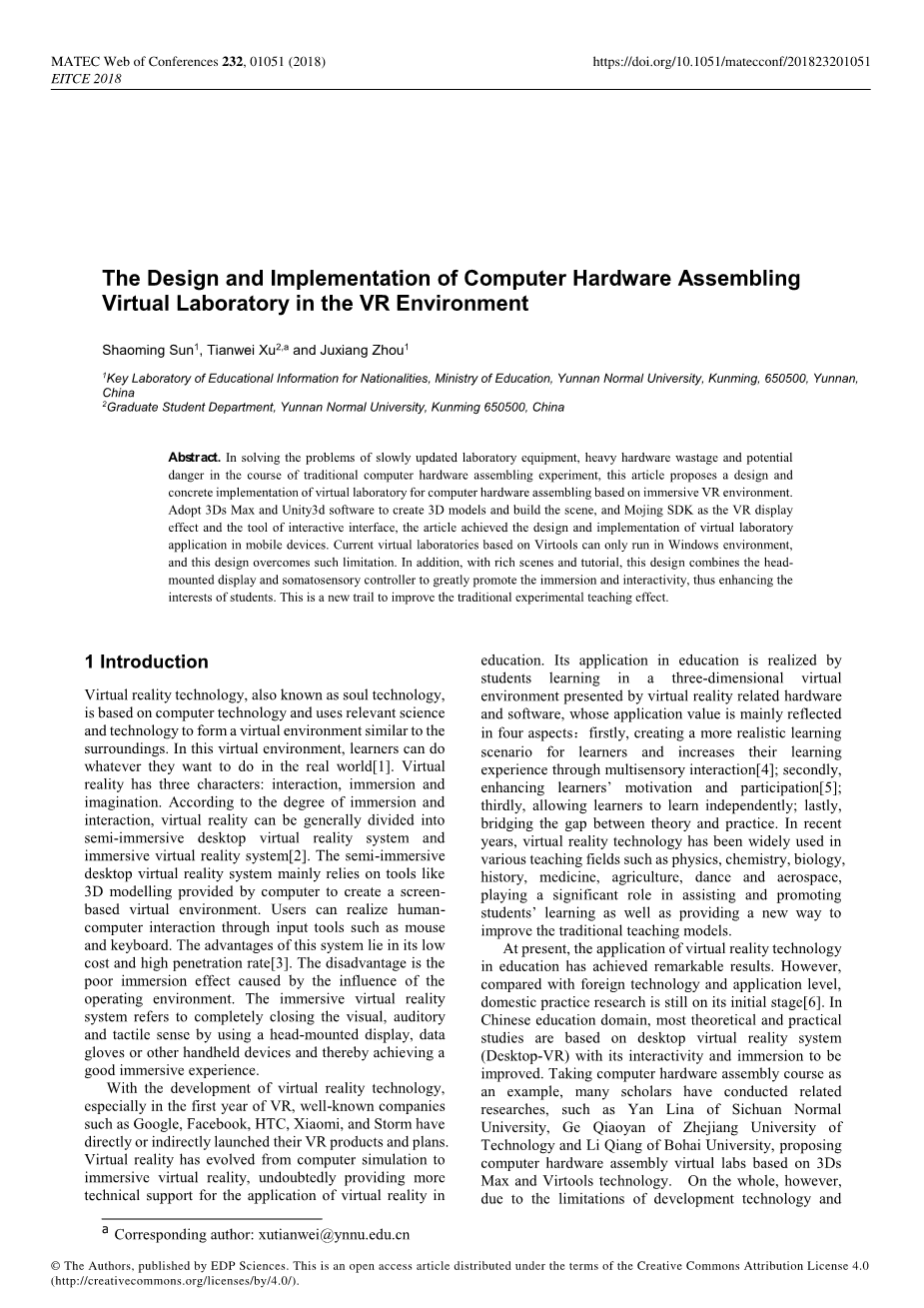 摘要:为了解决实验室设备更新缓慢、硬件浪费严重和潜力大的问题,本文针对传统计算机硬件装配实验过程中的危险,提出了一种设计方案基于沉浸式虚拟现实环境的计算机硬件装配虚拟实验室的具体的实现方法。采用3Ds Max和Unity3d软件创建3D模型,搭建场景,VR显示,采用Mojing SDK利用交互式界面的效果和工具,实现了虚拟实验室的设计与实现在移动设备中的应用。目前基于虚拟现实的虚拟实验室只能在Windows环境下运行,这种设计克服了这种局限性。此外,还具有丰富的场景和教程,本设计结合了head-安装显示器和体感控制器,大大提高沉浸感和交互性,从而增强学生的兴趣。这是一条提高传统实验教学效果的新途径。