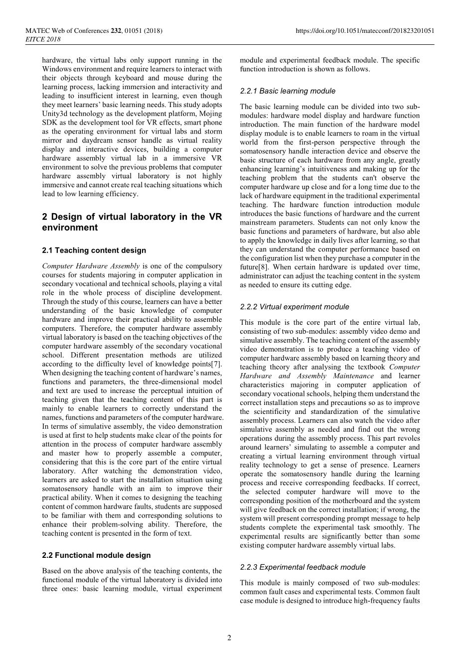随着虚拟现实技术的发展,特别是在VR的第一年,谷歌,Facebook,HTC,小米和风暴等知名公司都直接或间接推出了他们的VR产品和计划。虚拟现实已经从计算机模拟演变为沉浸式虚拟现实,无疑为虚拟现实在教育中的应用提供了更多的技术支持。它在教育中的应用是由学生在虚拟现实相关硬件和软件呈现的三维虚拟环境中学习而实现的,其应用价值主要体现在四个方面:第一,为学习者创造更真实的学习场景,增加学习体验通过多感官互动[4];第二,提高学习者的动机和参与度[5];第三,让学习者独立学习;最后,弥合理论与实践之间的差距。近年来,虚拟现实技术被广泛应用于物理,化学,生物,历史,医学,农业,舞蹈,航空等各个教学领域,在协助和促进学生学习方面发挥了重要作用,并为学生提供了新的途径去改进传统的教学模式。目前,虚拟现实技术在教育中的应用取得了显着成效。但是,与国外技术和应用水平相比,国内实践研究尚处于起步阶段[6]。在中国教育领域,大多数理论和实践研究都是基于桌面虚拟现实系统(Desktop-VR),其交互性和沉浸性有待改善。以计算机硬件装配课程为例,许多学者进行了相关的研究,如四川师范大学的严丽娜,浙江工业大学的葛巧燕和渤海大学的李强,提出了基于3Ds Max和虚拟现实技术的计算机硬件组装虚拟实验室。但总的来说,由于开发技术和硬件的限制,虚拟实验室只支持在Windows环境中运行,并要求学习者在学习过程中通过键盘和鼠标与对象进行交互,缺乏沉浸感和交互性,导致学习兴趣不足,只能满足学习者的基本学习需求。本研究采用Unity3d技术作为开发平台,Mojing SDK作为VR效果的开发工具,智能手机作为虚拟实验室的操作环境,暴风眼镜和日梦传感器处理为虚拟现实显示和交互设备,在沉浸式VR环境中构建的虚拟计算机硬件组件实验室解决了以前的问题,即计算机硬件组装虚拟实验室没有身临其境,不能更改导致学习效率低的教学现状。