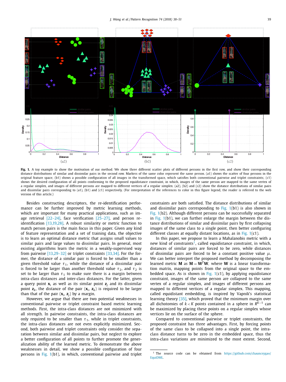 在本文中,我们提出用一种新的约束来学习马氏距离度量,称为等距离约束,其中,相似对的距离被迫为零,而不相似对的距离被强制为一个恒定的正值mu; 。通过将学习量度M分解为,我们可以更好地解释所提出的方法,其中W是线性变换矩阵,从原始空间到嵌入空间的映射点。如图1(c1)所示,通过应用等距约束,同一个人的图像被折叠到普通单形的同一顶点,不同人的图像被映射到普通单形的不同顶点。这种称为等距离嵌入的映射受到了Vapnik的统计学习理论的启发[35],该理论证明了中包含在一个球体中的k lt;K点的所有二分的最小边界可以通过将这些点放在一个常规单形的顶点位于球体的表面上。