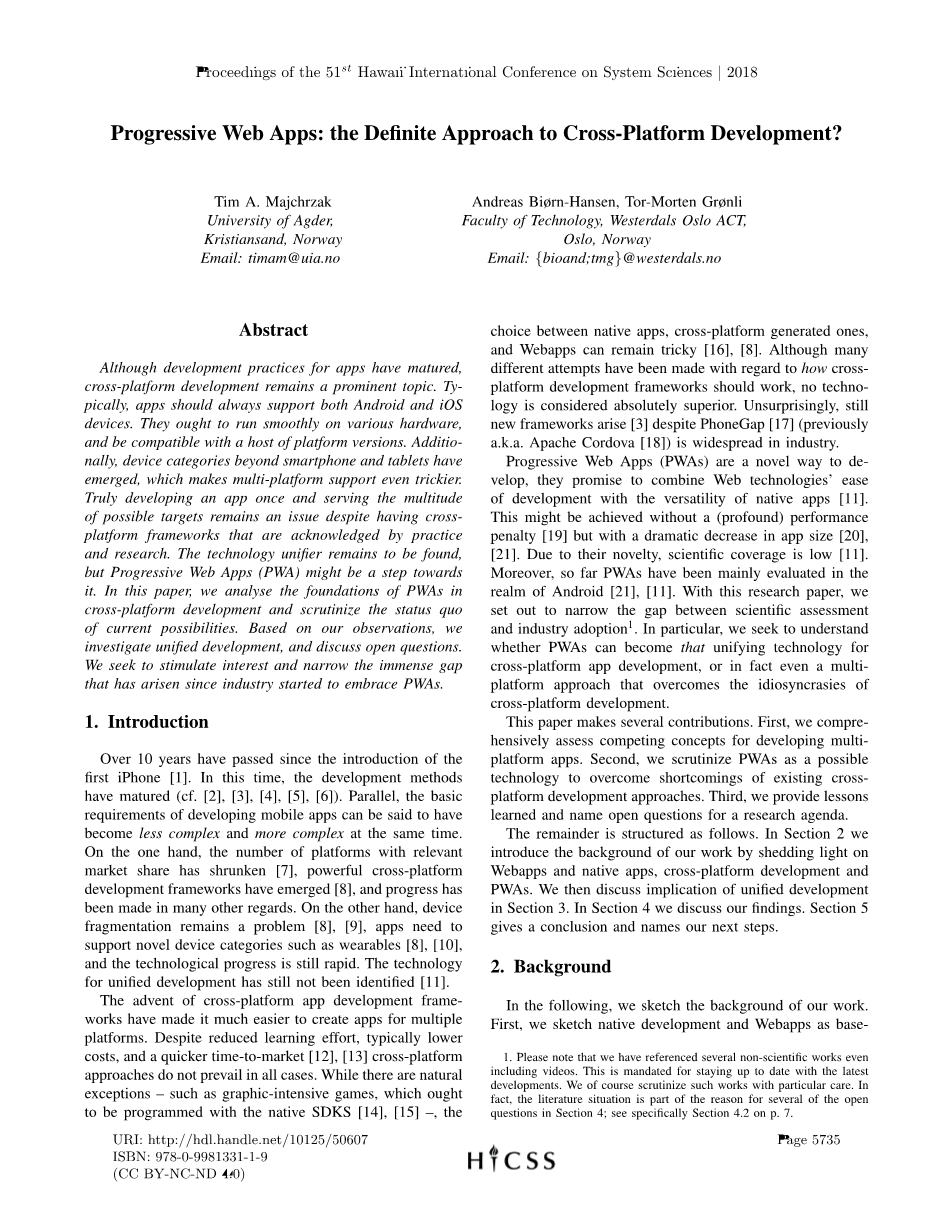 本文做出了几点贡献。首先,我们全面评估开发多平台应用程序的竞争概念。其次,我们仔细研究PWA作为克服现有跨平台开发方法缺陷的可能技术。第三,我们提供经验教训并为研究议程提出未决问题。