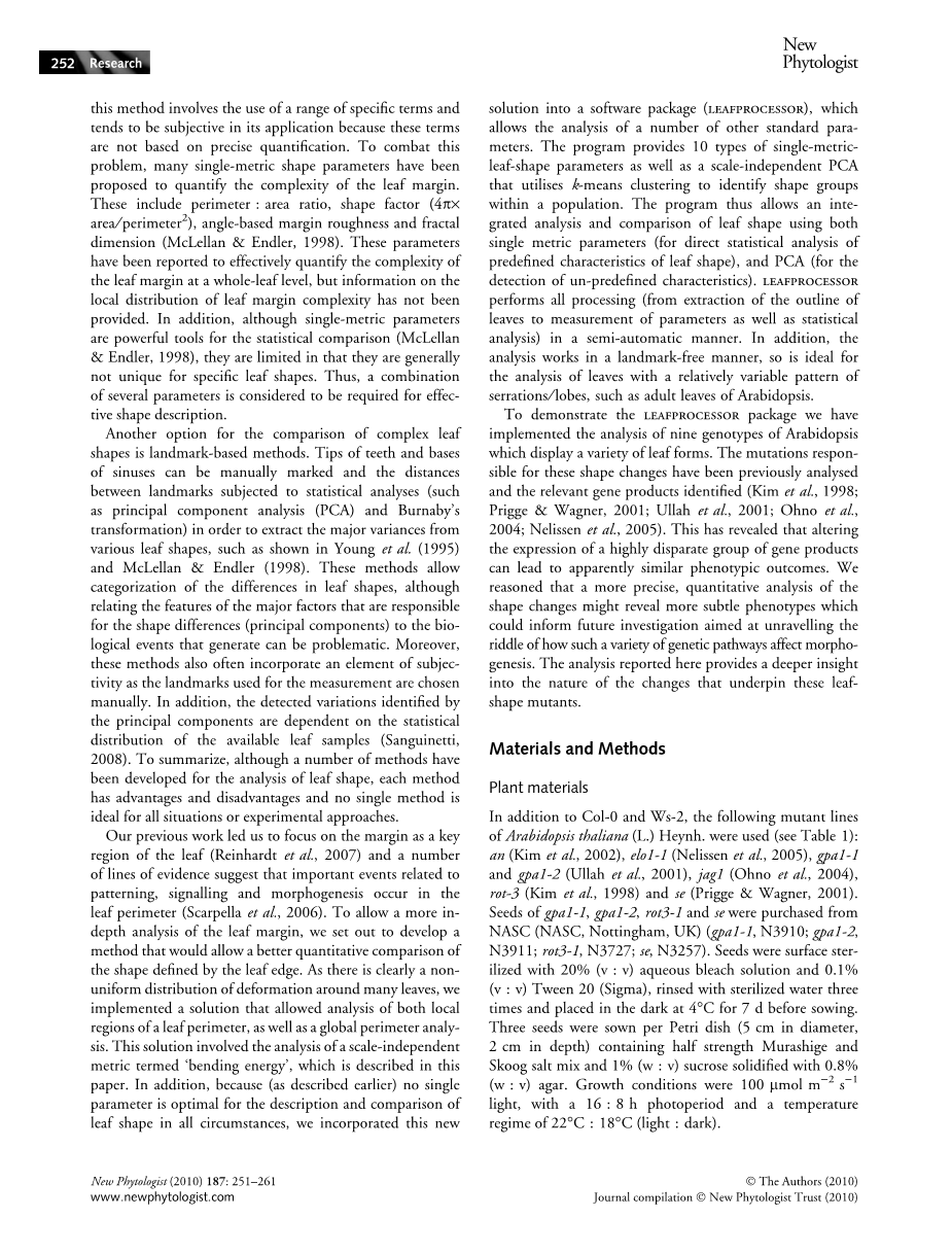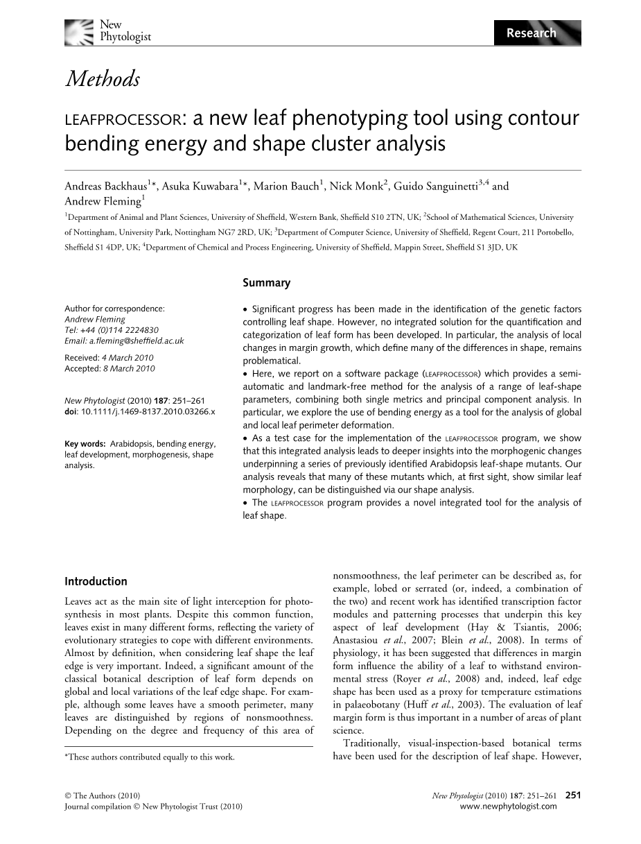 我们之前的工作使我们把焦点集中在叶子的关键区域,大量的证据表明,与模式、信号和形态发生有关的重要事件都发生在叶子的边缘。为了更深入地分析叶片边缘,我们着手开发一种方法,可以更好地定量地比较叶片边缘所定义的形状。由于在许多叶片上有明显的不均匀分布,我们实现了一种解决方案,允许对叶周长的局部区域进行分析,并对全局范围进行分析。这一解决方案涉及到一种称为弯曲能的尺度无关的度量,这是本文所描述的。此外,由于(如前所述)在所有情况下,对于叶形的描述和比较,没有一个参数是最优的。在比较所有情况下,我们将这个新解决方案合并到一个软件包(leafprocessor)中,它允许对许多其他标准参数进行分析。该程序提供了10种类型的单指标形状参数,以及一个使用k-means聚类来识别群体内的形状群的标量独立的PCA。因此,该程序允许对叶子形状进行综合分析和比较,同时使用单指标参数(用于对叶形的预定义特征进行直接统计分析)和PCA(用于检测非预定义特征)。leafprocessor以半自动的方式执行所有的处理(从叶子的轮廓提取到参数的测量以及统计分析)。此外,该分析还以自由标记的方式进行,因此,理想的分析方法是用一种相对可变的锯齿状叶,如拟南芥的成年叶片。