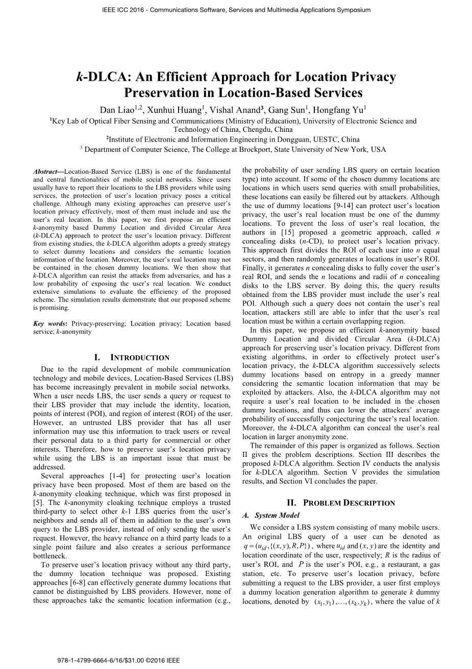 在本文中,我们提出了一种有效的基于k-匿名的虚拟位置和分割圆形区域(k-dlca)方法来保护用户的位置隐私。与现有的算法不同,为了有效地保护用户的位置隐私,k-DLCA算法以贪婪的方式,考虑了可能被攻击者利用的语义位置信息,以贪婪的方式选择了基于熵的虚拟位置。另外,k-dlca算法可能不需要用户的真实位置将被包含在所选的虚拟位置中,这样就可以降低攻击者成功猜测用户真实位置的平均概率。此外,k-DLCA算法可以在较大的匿名区域隐藏用户的真实位置。