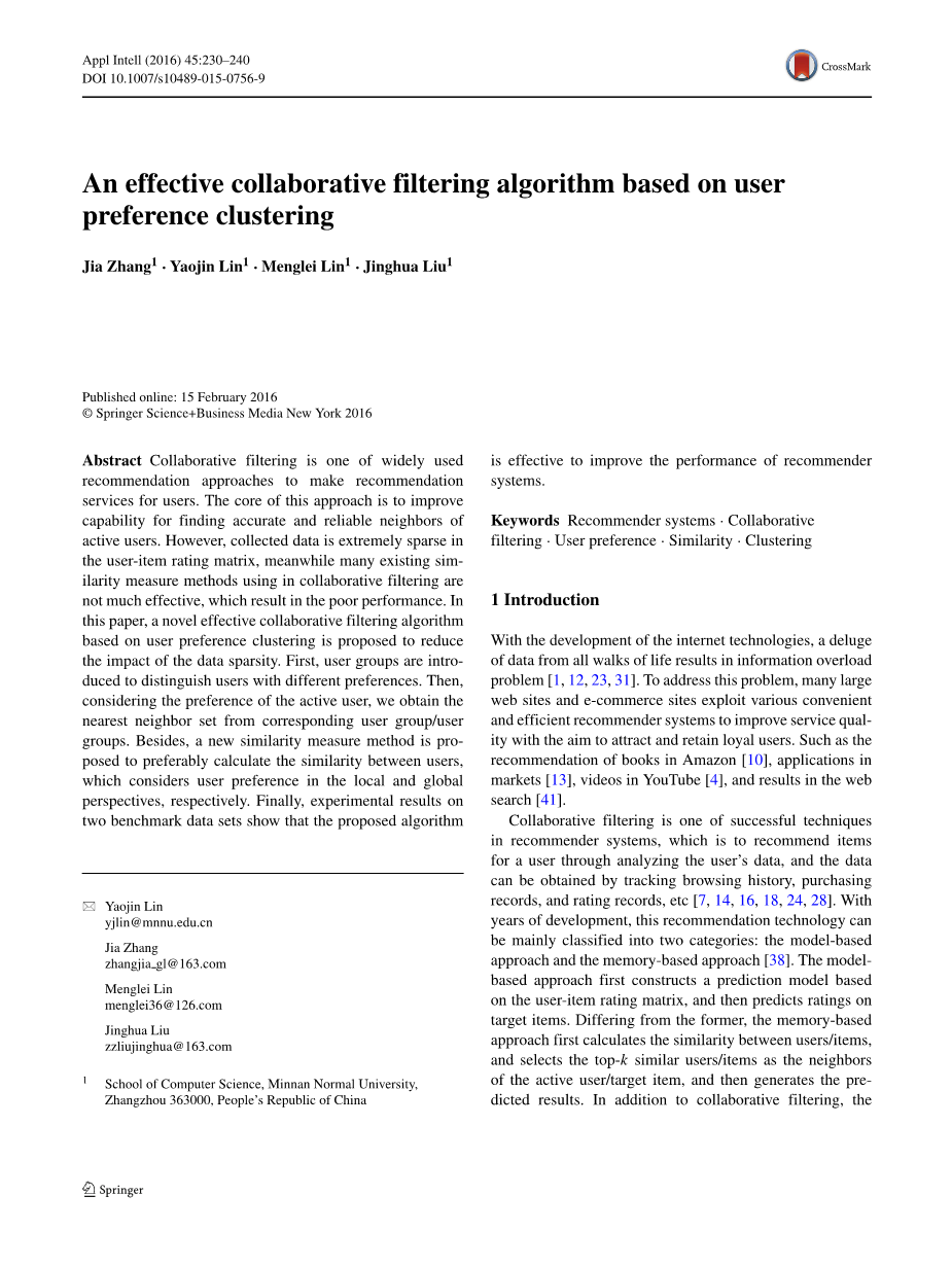 摘要:协同过滤是为用户提供推荐服务的广泛使用的推荐方法之一。这种方法的核心是提高寻找活跃用户的准确和可靠邻居的能力。然而,收集的数据在用户项目评分矩阵中非常稀疏,同时许多现有的用于协同过滤的相似性度量方法效果不佳,导致性能较差。本文提出了一种基于用户偏好聚类的有效协同过滤算法,以减少数据稀疏性的影响。首先,引入用户组来区分具有不同偏好的用户。然后,考虑到活动用户的偏好,我们从相应的用户组/用户组获得最近邻居集合。此外,还提出了一种新的相似性度量方法,以较好地计算用户间的相似度,分别考虑用户在局部和全局视角下的偏好。最后,两个基准数据集上的实验结果表明,该算法对提高推荐系统的性能是有效的。