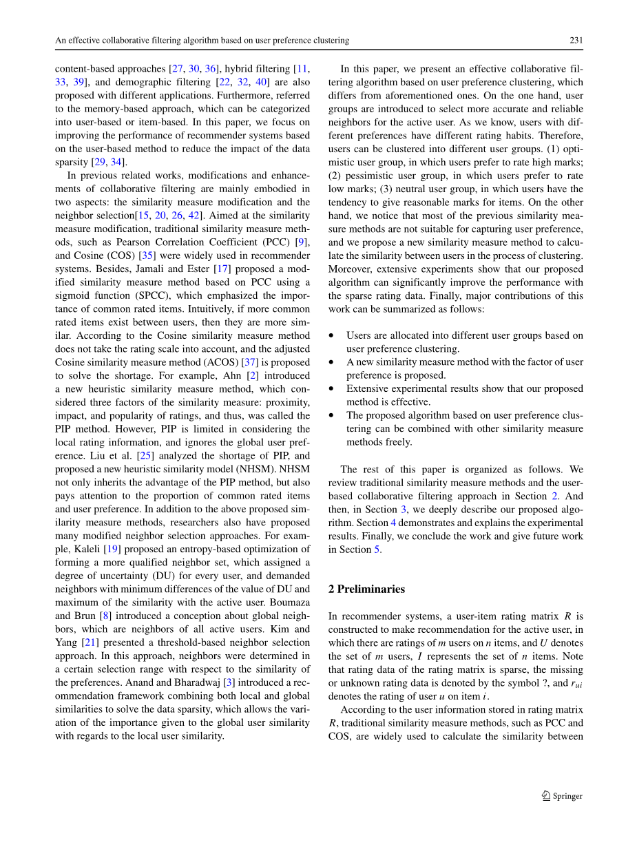 在以前的相关工作中,协同过滤的修改和增强主要体现在两个方面:相似性度量修改和邻居选择[15,20,26,42]。针对相似性度量的修改,传统的相似性度量方法,如皮尔森相关系数(PCC)[9]和余弦相似性度量(COS)[35]等被广泛应用于推荐系统。此外,Jamali和Ester [17]提出了一种基于PCC的改进的基于S形函数(SPCC)的相似性度量方法,该方法强调了常用项目的重要性。直观地说,如果用户之间存在更常见的额定项目,则它们更相似。根据余弦相似性度量方法不考虑等级尺度,提出了调整后的余弦相似性度量方法(ACOS)[37]来解决这一不足。例如,Ahn [2]引入了一种新的启发式相似性度量方法,该方法考虑了相似性度量的三个因素:接近度,影响度和评级流行度,因此被称为PIP方法。但是,PIP在考虑局部评级信息时受到限制,并忽略全局用户偏好。刘等人。 [25]分析了PIP的不足,并提出了一种新的启发式相似度模型(NHSM)。 NHSM不仅继承了PIP方法的优点,还注重普通评分项目和用户偏好的比例。除了上面提出的相似性测量方法之外,研究人员还提出了许多改进的邻近选择方法。例如,Kaleli [19]提出了一种基于熵的优化方法来形成一个更合格的邻居集合,该集合为每个用户分配一定的不确定度(DU),并要求邻居的DU值最小和相似度最大与活跃的用户。 Boumaza和Brun [8]介绍了一个关于全局邻居的概念,它是所有活跃用户的邻居。 Kim和Yang [21]提出了一种基于阈值的邻居选择方法。在这种方法中,邻居是根据偏好的相似性在一定的选择范围内确定的。 Anand和Bharadwaj [3]引入了一种结合局部和全局相似性的解决数据稀疏性的推荐框架,该框架允许在局部用户相似性方面给予全局用户相似性的重要性的变化。