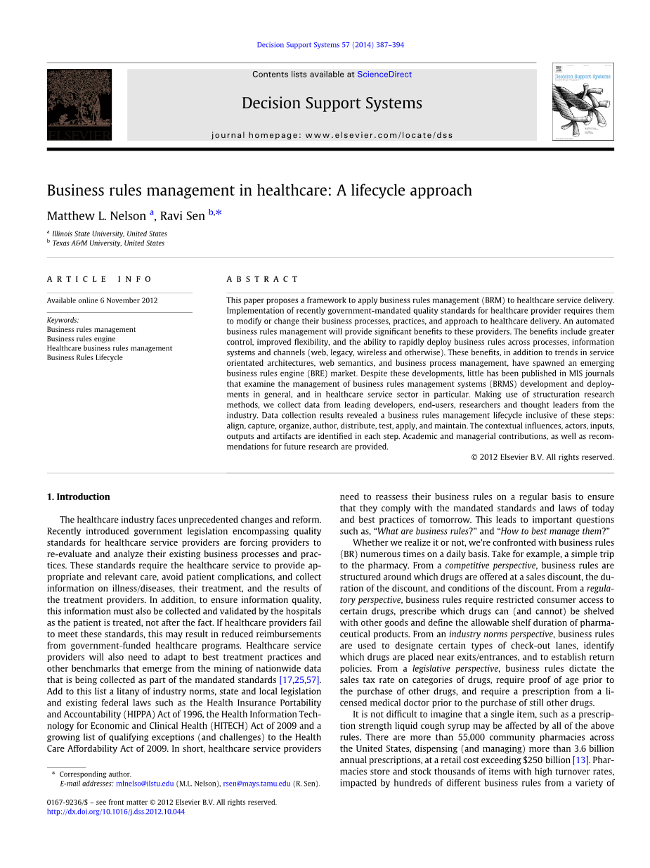 本文提出了将业务规则管理(BRM)应用于医疗服务交付的框架。最近政府规定的医疗服务提供者质量标准要求他们修改或改变他们的业务流程、做法和医疗保健交付方式。自动化的业务规则管理将为这些提供者带来显著的好处。 其好处包括更强的控制、更好的灵活性,以及跨流程、信息系统和通道(网络、遗留系统、无线和其他)快速部署业务规则的能力。除了面向服务的体系结构、web语义和业务流程管理的趋势之外,这些好处还催生了一个新兴的业务规则引擎(BRE)市场。 尽管有这些进展,但在检测业务规则管理系统(BRMS)的发展,特别是在医疗服务领域的管理方面,在MIS杂志上几乎没有发表过什么。利用结构化研究方法,我们从业界领先的开发人员、终端用户、研究人员和思想领袖那里收集数据。数据收集结果揭示了一个业务规则管理生命周期,包括这些步骤:对齐、捕获、组织、作者、分发、测试、应用和维护。在每一步中都确定了上下文影响、参与者、输入、输出和工件。 提供了学术和管理方面的贡献,并为未来的研究提供了建议。