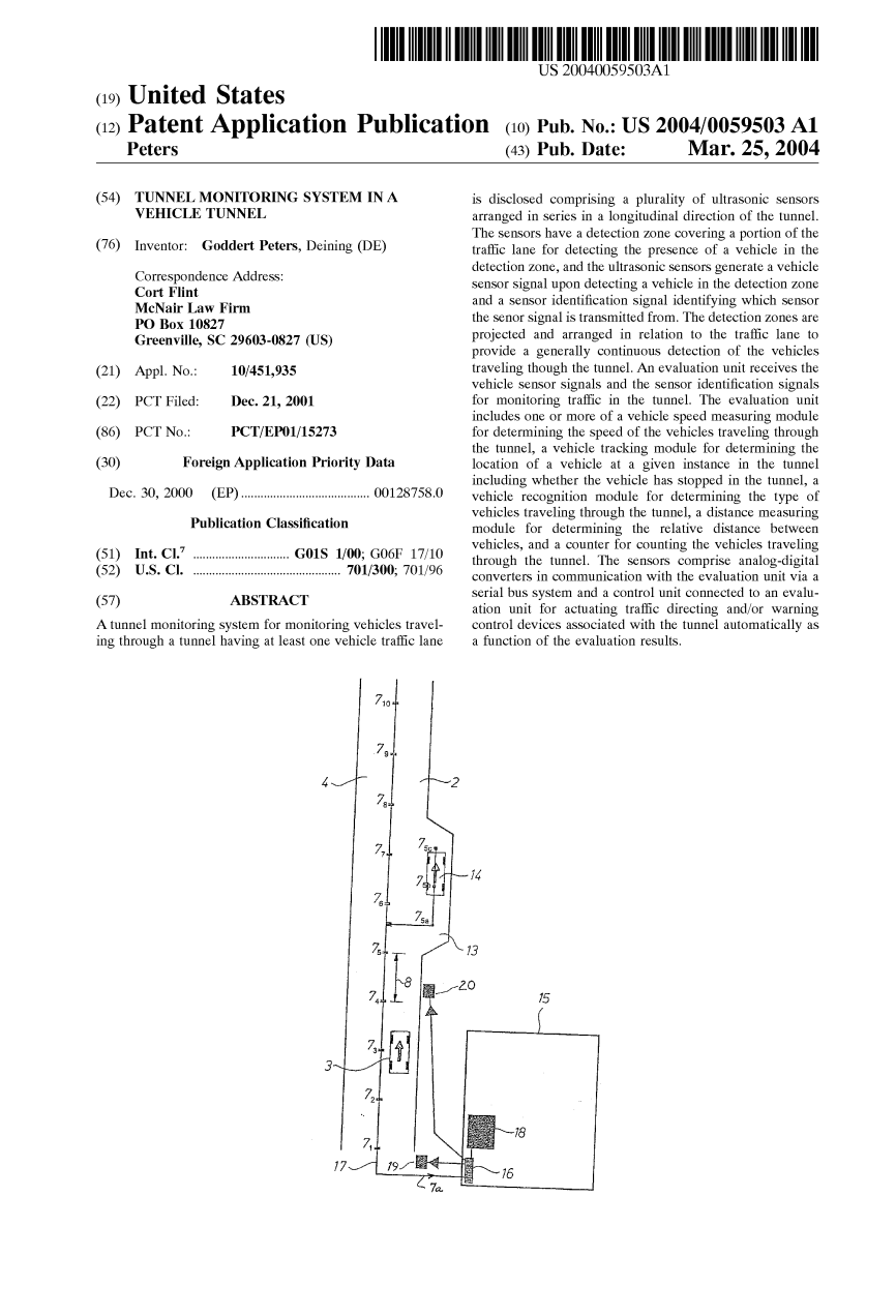 [0002]通常已知用于监测隧道中的车辆的各种设计的隧道监测系统。 例如,隧道监控系统是已知的,其中火情报告装置沿隧道的纵向安装。 该系统设计用于探测和定位隧道内可能发生的火灾,特别是燃烧的车辆。 该系统可以包括在检测到火灾时启动自动报警装置,交通引导装置或锁定装置的控制装置。 这种监测系统仅适用于识别由于火灾而发生的危险情况。