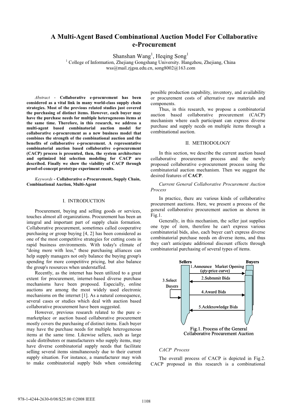 在这一节,我们用组合拍卖机制描述了基于当前拍卖的协同采购过程和新提出的协同电子采购过程。然后我们描述了基于组合拍卖协同电子采购的特点。