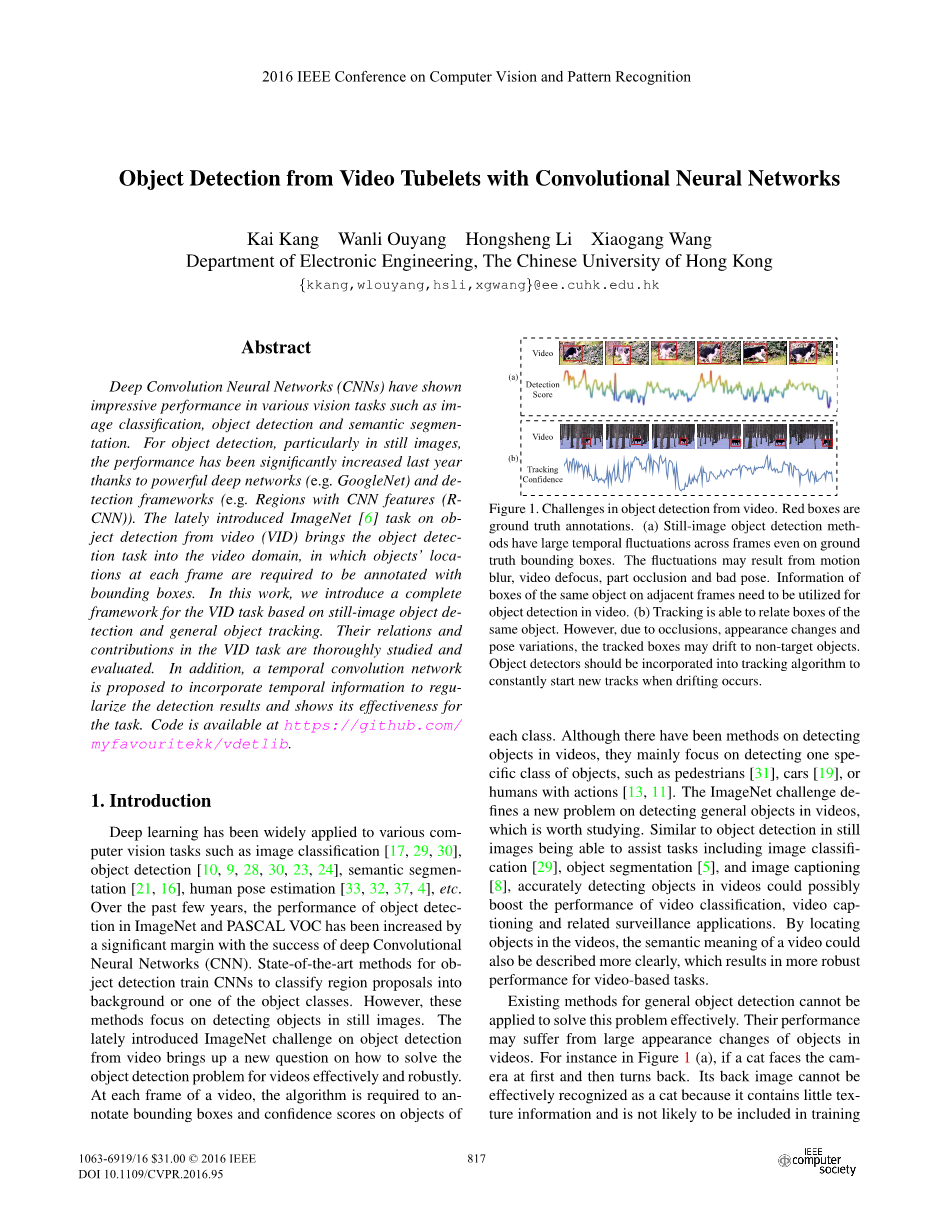 深度卷积神经网络(CNNs)在图像分类、目标检测和语义划分等不同的视觉任务中有着令人印象深刻的表现。得益于强大的深度网络(例如GoogleNet)和检测框架(例如区域和CNN特征(RCNN)),对于目标检测,特别是在静态图像领域,其性能显著提高。最近引入来自于视频目标检测的ImageNet 将目标检测任务引入到视频领域。在视频领域中,每个帧中目标的位置都需要用窗口进行标注。在这项工作中,我们介绍了一个基于静态图像目标检测和一般目标跟踪的VID(视频目标检测)的任务框架。它们在VID(视频目标检测)任务中的关系和贡献被彻底地研究和评估。此外,还提出了一个时域卷积网络,将时间信息整合到系统的检测结果中,并显示其对任务的有效性。