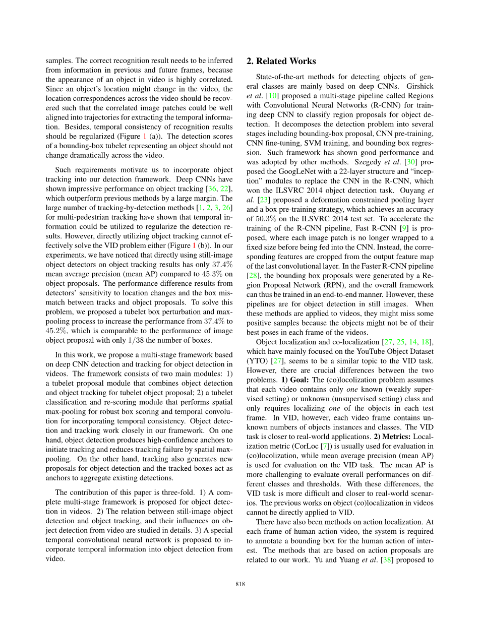 最先进的探测普通类目标的方法主要是基于深度卷积神经网络。Girshick等人提出了一个多阶段的管道,称为区域卷积神经网络(R-CNN),用于训练美国有线电视新闻网,以对区域的目标探测进行分类。它将探测问题分解为几个阶段,包括边界框提议、CNN预训练、CNN的微调、SVM训练和边界框回归。这样的框架表现良好,并被其他方法所采用。Szegedy等利用一个22层的结构和inception模块提出了GoogLeNet来取代CNN在r-CNN中的模块,赢得了ILSVRC 2014的目标检测任务。Ouyang等提出了一种变形约束池层和一盒训练的策略, 在ILSVRC 2014测试集达到50.3%的精度。加速R-CNN管道的培训,提出了Fast R-CNN,每个图像块包装不再是一个固定大小的送入CNN。相反,对应的特性是从上一个卷积层的输出特性映射中裁剪的。在更快的Fast R-CNN管道中,边界框提议是由一个区域提议网络(RPN)生成的,因此整个框架可以以端到端方式进行培训。然而,这些管道是用于静态图像中的目标检测。当这些方法应用于视频时,它们可能会错过一些正确的样本,因为这些目标可能不是它们在视频的每一帧中最好的姿势。