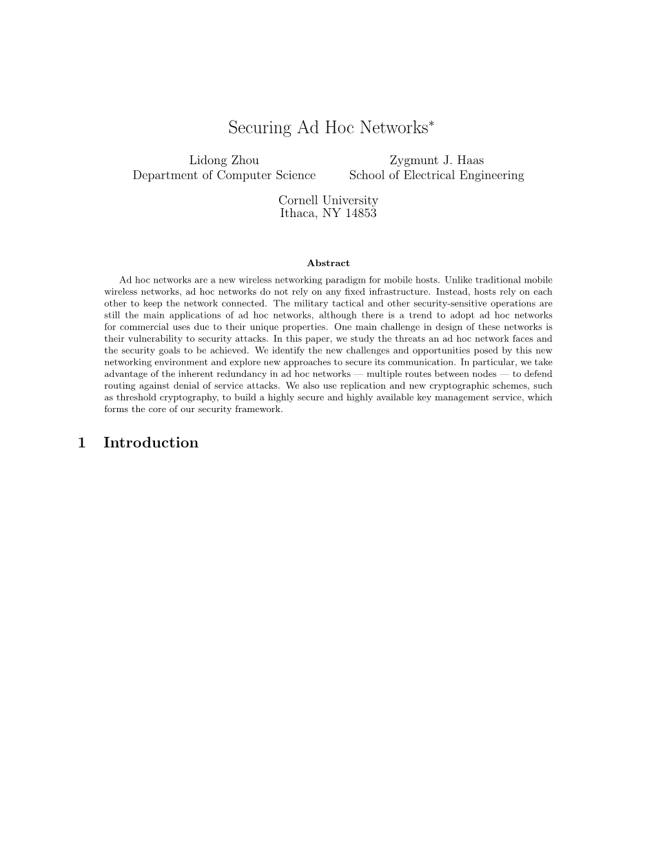 Ad hoc网络是一种面向移动主机的新型无线网络模式,与传统的移动无线网络不同,adhoc网络不依赖任何固定的基础设施。相反,主机相互依赖以保持网络连接。军事战术和其他安全敏感作战仍然是ad hoc网络的主要应用,但由于adhoc网络的独特性能,其商业化应用已成为一种趋势。设计这些网络的一个主要挑战是它们易受安全攻击。本文研究了ad hoc网络所面临的威胁和要达到的安全目标。我们确定了这种新的网络环境带来的新挑战和机遇,并探索了确保其通信安全的新方法。特别是,我们利用ad hoc网络固有的冗余性(节点间的多条路由)来防御拒绝服务攻击。我们还使用复制和新的加密方案(如阈值加密)来构建高度安全和高可用的密钥管理服务,这构成了我们安全框架的核心。