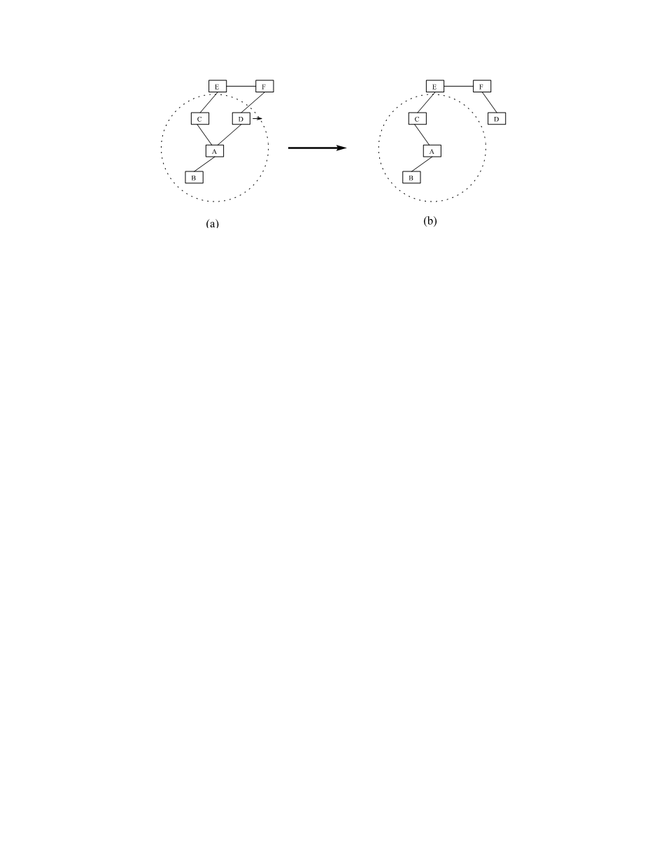 图1:A D hoc网络中的拓扑变化:节点A、B、C、D、E和F构成一个adhoc网络。圆圈代表节点A的无线电范围。网络最初的拓扑结构在(A)中。当节点D移出A的无线电范围,网络拓扑变为(b)中的一个。