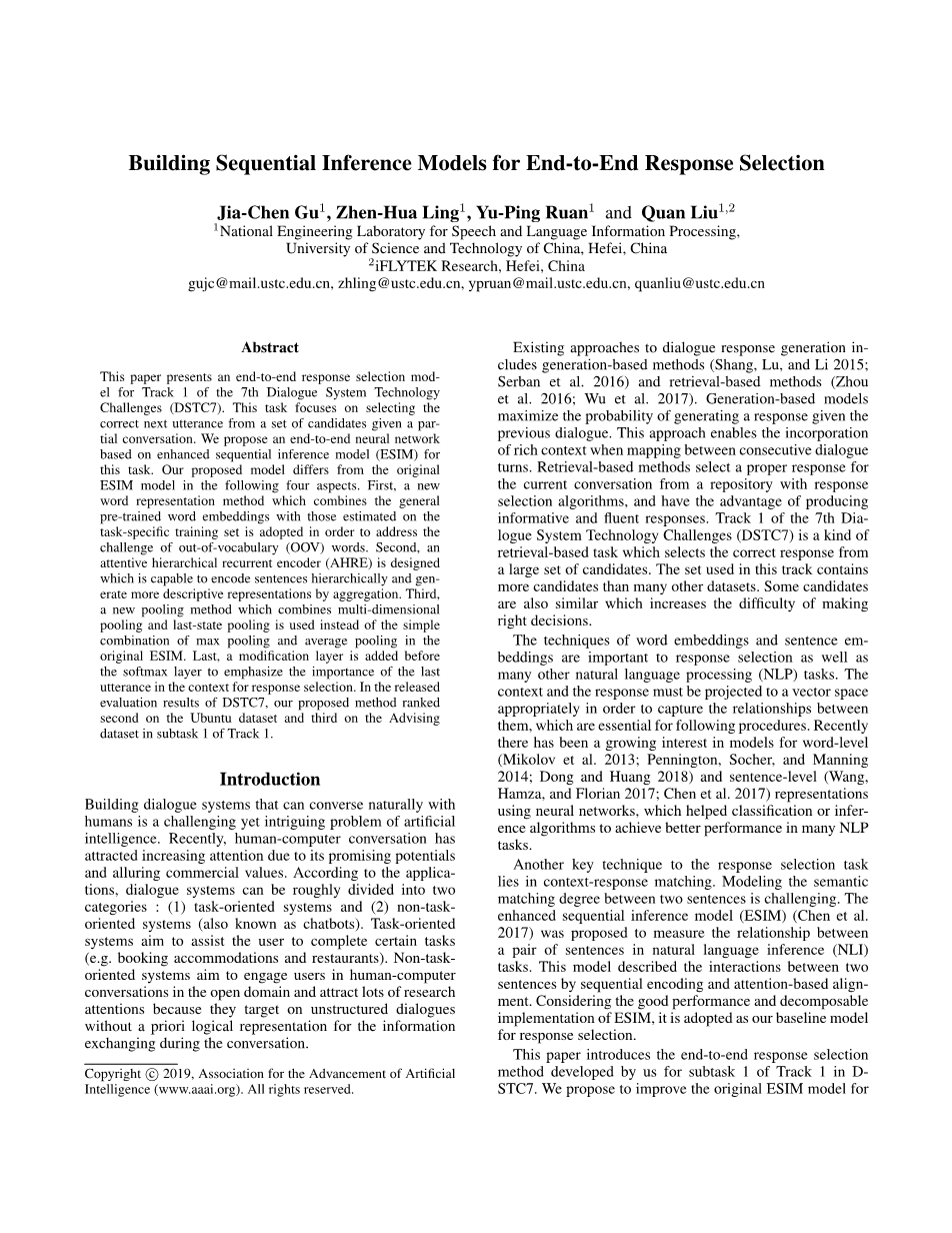 本文提出了第七届对话系统技术的端到端响应选择模型挑战(DSTC7)。该任务着重于选择在进行部分对话的情况下,纠正一组候选者的下一个发音。我们为这个任务提出了一个基于增强型顺序推理模型(ESIM)端到端的神经网络。我们提出的模型与原始ESIM模型包括以下四个方面的不同。首先,结合一般的预训练的词嵌入与估计的词嵌入新的单词表示方法,采用针对特定任务的培训集以解决词汇量(OOV)单词的挑战。第二,专心分层递归编码器(AHRE)设计能够对句子进行分层编码,并通过聚合生成更多描述性表示。第三,结合多维的新池化方法池和最后一个状态池代替了原始的ESIM中简单的最大池和平均池的组合。最后,在softmax层之前的修改层强调最后在上下文中进行发声以选择响应的重要性。在发布的DSTC7评估结果中,我们提出的方法在Track 1的子任务1中在Ubuntu数据集上排名第二,在Advising数据集上排名第三。