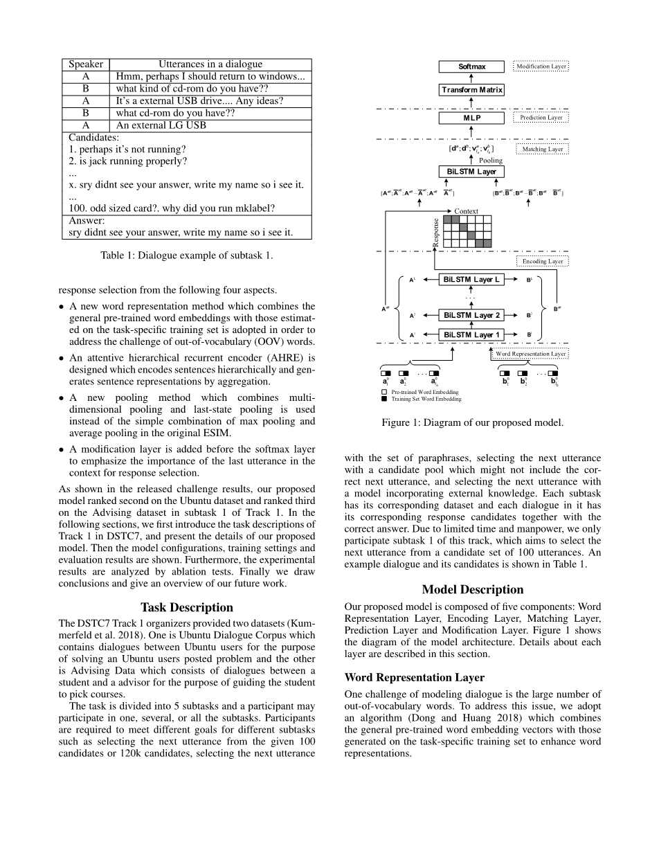 DSTC7 Track 1的组织者提供了两个数据集(Kummerfeld et al.2018)。 一个是Ubuntu对话语料库,其中包含Ubuntu用户之间的对话,目的是解决Ubuntu用户发布的问题。另一个是建议数据,它由学生和指导者之间的对话组成,目的是指导学生选择课程。该任务分为5个子任务,参与者可以参与一个、几个或所有子任务。参与者需要满足不同子任务的不同目标,例如从给定的100个候选者或120k个候选者中选择下一个发音,用复述集选择下一个话语,用可能不包括正确下一个话语的候选词组选择下一个话语,并使用结合了外部知识的模型选择下一个话语。每个子任务都有其对应的数据集,并且每个对话中都有其对应的响应候选者以及正确的答案。由于时间和人力有限,我们仅参与此曲目的子任务1,该任务旨在从100个语音的候选集中选择下一个语音。一个示例对话及其候选对象如表1所示。