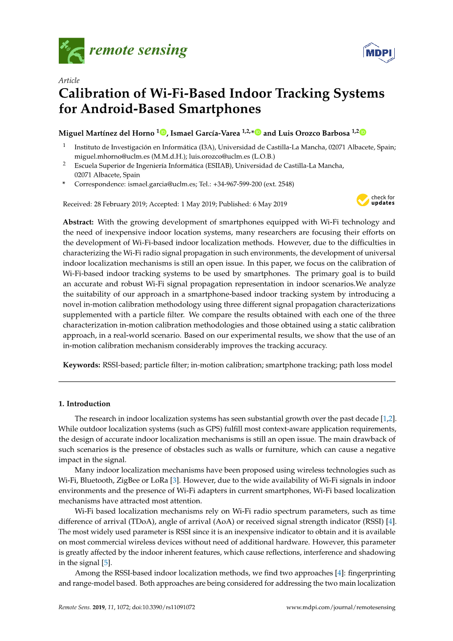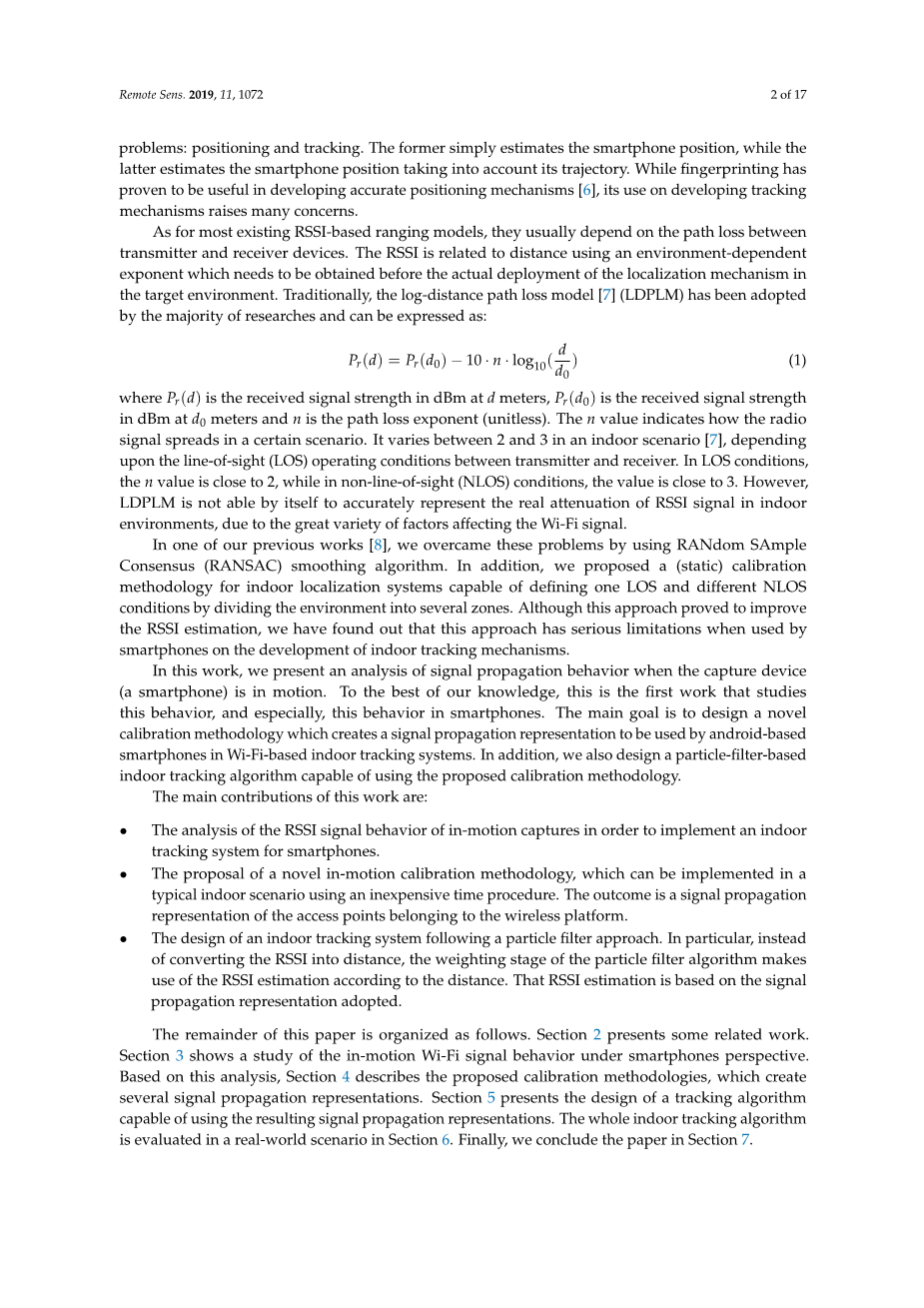 获得整个环境的单个参数值,但是,这种方法无法描述复杂现实环境中的信号传播。这是由于LDPLM无法在接收器和发送器设备之间存在NLOS情况的环境中准确表示Wi-Fi信号的实际衰减。 为了克服这个问题,Carrera等人。定义了获得特定模型的两种不同情况:一种用于LOS情况,另一种用于NLOS情况。但是,这种情况的定义取决于确定NLOS情况的RSSI值的确定。由于Wi-Fi信号传播的变化,该值可能会随时间变化,因此,系统可能会误解LOS和NLOS情况。相比之下,Martiacute;nez等人。根据环境平面图定义LOS和NLOS情况。由于可以正确地区分LOS和NLOS情况,因此该方法被证明更加准确。在本文中,我们介绍了一种新颖的运动校准方法,该方法基于粒子滤波器,其中我们根据距离估算RSSI,而不是将RSSI转换为距离。我们的数值结果显示了对定位估计性能的显着改善。