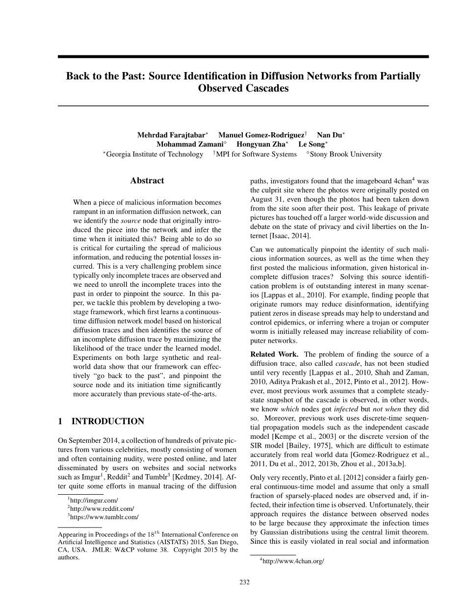 相关工作:直到最近才研究了寻找扩散迹线的来源(也称为级联)的问题[Lappas等,2010; Shah和Zaman,2010; Aditya Prakash等,2012; Pinto等,2012]。但是,大多数以前的工作都假设观察到了级联的完整稳态快照,换句话说,我们知道哪些节点被感染,但不知何时被感染。 此外,先前的工作使用离散时间顺序传播模型,例如独立的级联模型[Kempe等,2003]或SIR模型的离散版本[Bailey,1975],这些模型很难应用于真实世界的数据[Gomez -Rodriguez等,2011,Du等,2012,2013b,Zhou等,2013a,b]。