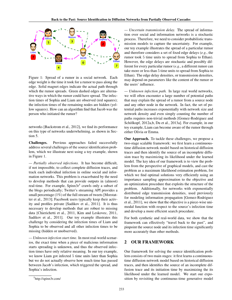 —未知的感染路径。在大型的现实世界网络中,我们经常会遇到大量潜在的路径,这些路径可能解释了来自源节点和网络中任何其他节点的谣言的传播。实际上,潜在路径集随网络规模和网络密度成指数增长,甚至简单地计算路径数量也需要非平凡的方法[Gomez-Rodriguez和Scholkopf,2012a,b,Du等,2013a]。 例如,在我们的玩具示例中,利亚姆可以通过奥利维亚(Olivia)或艾玛(Emma)来了解谣言。