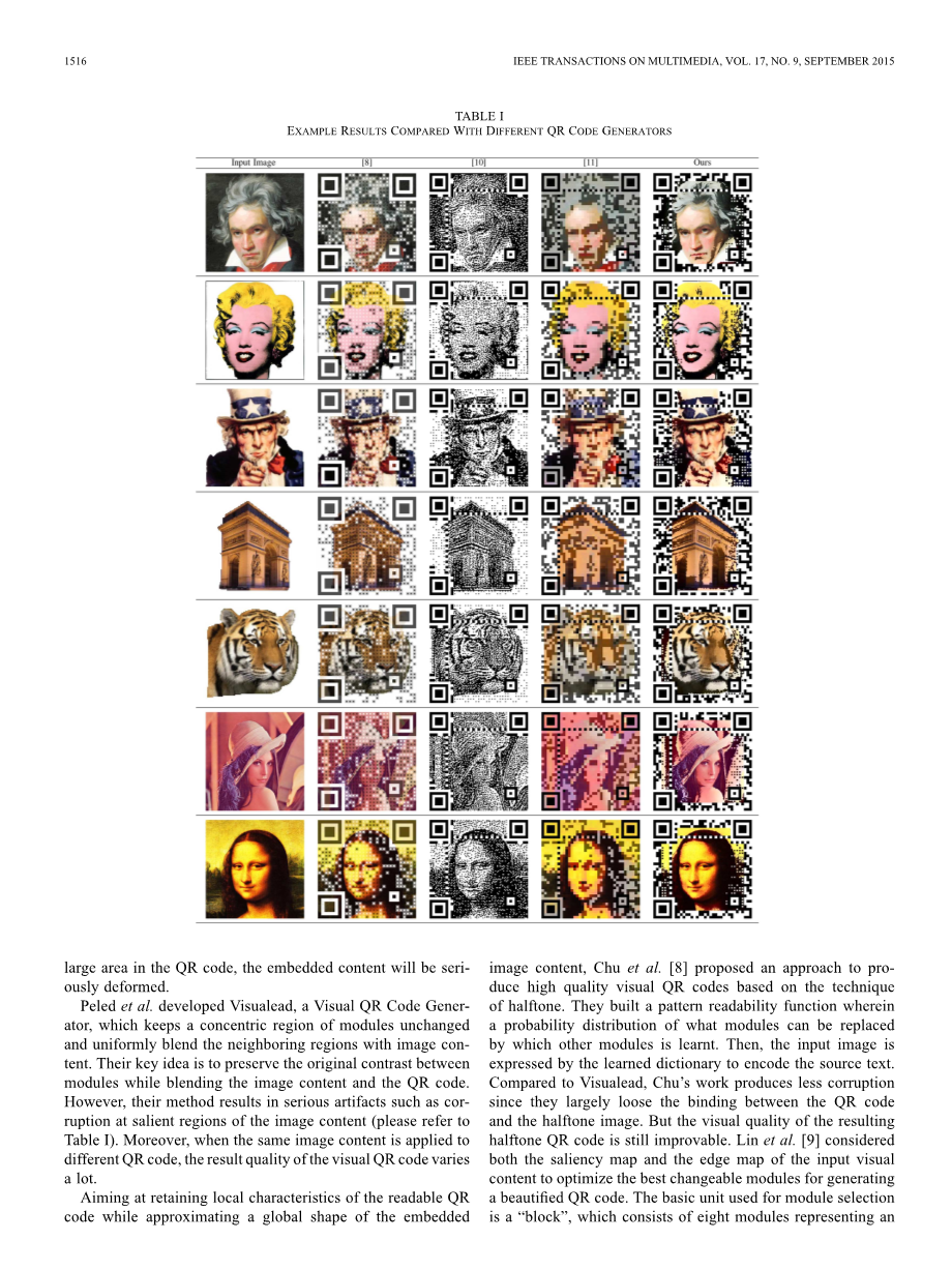 Peled等开发的Visualead是一种可视化的二维码生成器,它保持模块的同心圆区域不变,并将相邻区域与图像内容均匀混合。他们的核心思想是在融合图像内容和二维码的同时,保持模块之间的原始对比。然而,他们的方法造成了严重的伪影,如图像内容中显著区域的损坏(请参见表一)。此外,当相同的图像内容应用于不同的二维码时,视觉二维码的结果质量差异很大。