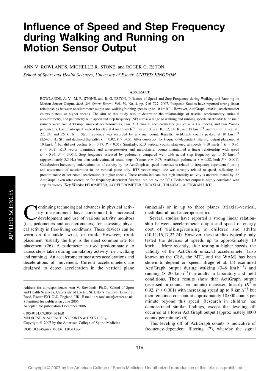 摘要 Ann V. V. Rowlands, Michelle R. Stone, Roger G. Eston. 步速和步频在步行和跑步中对运动传感器的影响Med. Sci. Sports Exerc., Vol. 39, No. 4, pp. 716–727, 2007.目的:研究报告指出,加速度计输出与步行/跑步速度之间的线性关系高达10km/h。然而,ActiGraph单轴加速度计以更高的速度计算平台,这项研究的目的是确定三轴加速度计,单轴加速度计和计步器与步速和步频(SF)在步行和跑步速度范围内的关系。方法:9名男性跑步者穿着两台ActiGraph单轴加速度计,两台RT3三轴加速度计(全部设置在1秒时间内)以及两台Yamax计步器。 每个参与者以4和6km/h步行60s,以10,12,14,16和18km/h跑步60s,以20,22,24和26km/h跑步30s。 步频通过视觉计数记录。 结果:ActiGraph计数达到了10km/h(2.5–3.0 Hz SF)(2.5–3.0 Hz SF)之后又下降了(r = 0.02, P 9 0.05)。经过频率相关滤波校正之后,输出稳定在10km/h,但没有下降(r = 0.77,P lt;0.05)。同样,RT3垂直计数在9 10km/h(r = 0.86,P G 0.01)。RT3矢量幅度和前后径和中外侧计数与速度(r 9 0.96,P G 0.001)保持线性关系。通过脚步测量评估的步频与实际步频相比,最高可达20kmIh,但低估了实际步长(Yamax r = 0.97; ActiGraph计步器r = 0.88,均P lt;0.001)。结论:随着速度的增加,ActiGraph活动低估的增加与频率相关的过滤和垂直平面加速度评估有关。RT3矢量幅度与速度密切相关,反映了高速时水平加速度的优势。 这些结果表明ActiGraph低估了高强度活动,即使在频率相关滤波校正之后,RT3也不能校正。 计步器输出与步频密切相关。