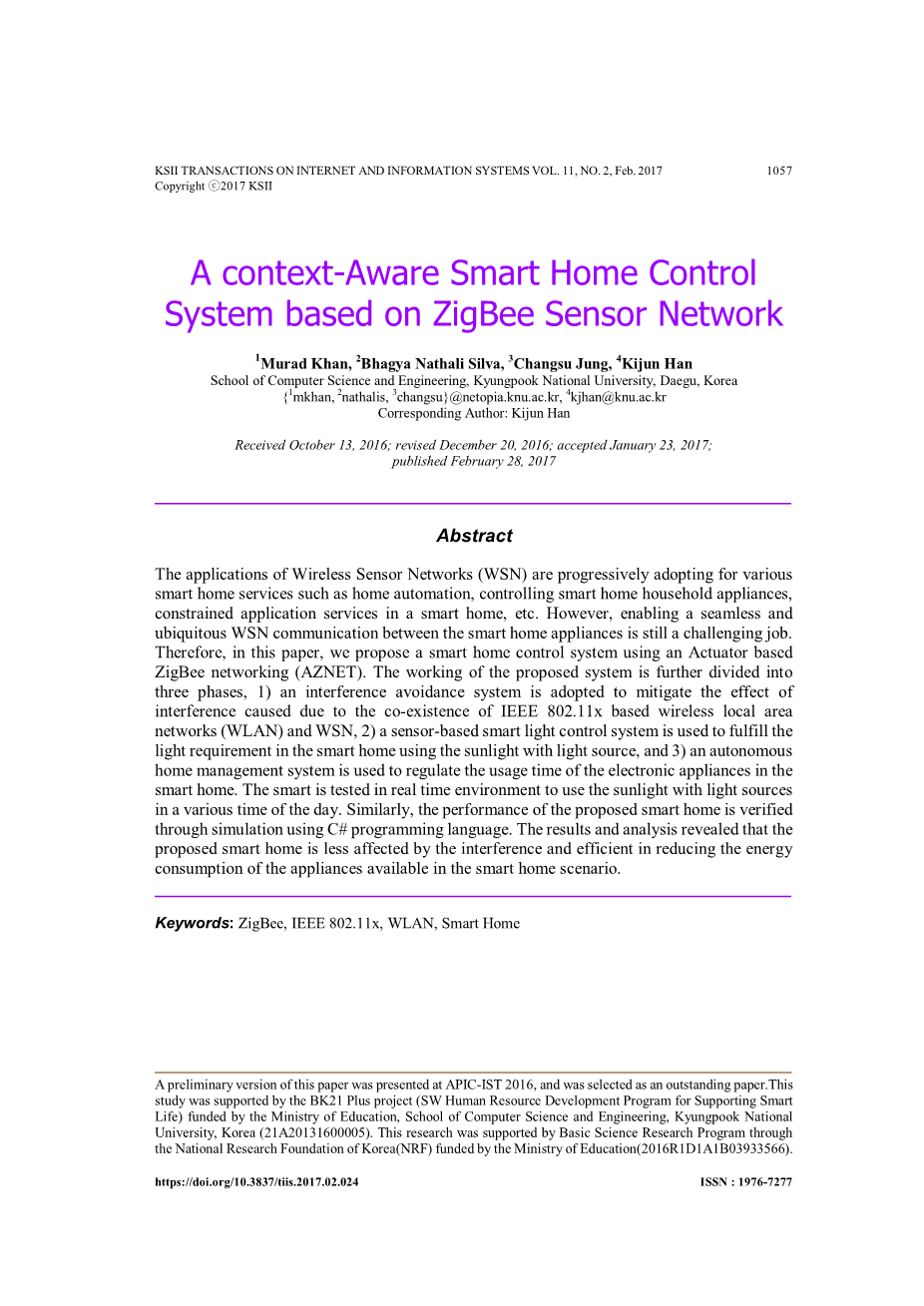 摘要:无线传感器网络(WSN)的应用逐渐适用于各种智能家居服务,如家庭自动化,智能家居家用电器,智能家居中的受限应用服务等。然而,实现智能家电之间的无缝和无处不在的WSN通信仍然是一项具有挑战性的工作。因此,在本文中,我们提出了一种使用基于执行器的ZigBee网络(AZNET)的智能家居控制系统。提出的系统的工作进一步分为三个阶段,1)采用干扰避免系统来减轻由于基于IEEE 802.11x的无线局域网(WLAN)和WSN的共存而引起的干扰的影响,2)采用基于传感器的智能照明控制系统,利用光源的阳光来满足智能家居的光照需求,和3)一个自主的家庭管理系统用于调节智能家居中电子设备的使用时间。该智能系统在实时环境下进行测试,以便在一天中的不同时间使用带有光源的阳光。类似地,通过使用C#编程语言的仿真来验证所提出的智能家居的性能。结果和分析显示,提出的智能家居方案中可用的设备的能耗降低的受干扰和效率影响较小。