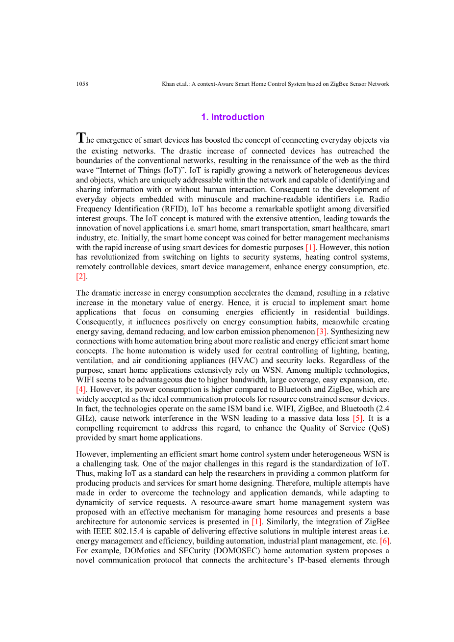 然而,在异构无线传感器网络下实现高效的智能家居控制系统是一项具有挑战性的任务。 这方面的主要挑战之一是物联网的标准化。 因此,以物联网为标准,可以帮助研究人员为智能家居设计提供生产产品和服务的共同平台。 因此,为了克服技术和应用需求,在适应服务请求的动态性的同时进行了多次尝试。 提出了一种资源感知智能家居管理系统,具有管理家庭资源的有效机制,并提出了自主服务的基础架构[1]。类似地,ZigBee与IEEE 802.15.4的集成能够在多个兴趣领域提供有效的解决方案,即能源管理和效率,楼宇自动化,工业设备管理等[6]。例如,内部和安全(DOMOSEC)家庭自动化系统提出了一种新颖的通信协议,该协议通过使用ZigBee技术的UDP连接架构的基于IP的元件[2]。此外,DOMOSEC已经发展到适应于关于背景要求的多个环境,即温室,电子卫生,老年护理和能源效率。 然而,DOMOSEC没有提供任何避免干扰和控制丢包的解决方案,从而最终影响智能家居自动化系统的性能。 类似地,目前的文献中还存在许多其他挑战,例如高能量消耗,由于异质技术的共存而引起的高分组丢失,智能光控系统等。