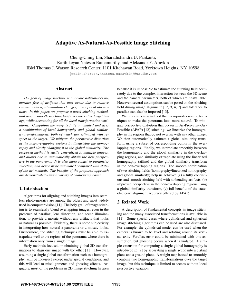 图像拼接的目标是生成没有不自然感的看起来自然的拼接图像,其中的不自然可能源于摄像头的相对移动、光线变化及视觉失常。在本论文中,我们提出了一种新型的拼接方法,该方法利用完整的目标图像中的平滑拼接域,同时还考虑了所有的局部变换的变化。扭曲参数的计算是完全自动的,在计算过程中利用了局部单应性和全局相似性变换。其中,局部单应性和全局相似性变换都是在参考了目标图像的情况下计算的。我们通过将单应性线性化并将其缓慢地改变为全局相似性矩阵减轻了非重叠区域的透视畸变。这一方法可以很容易地泛化到多张图像上,并且能自动地取得全景图的最佳透视效果。由于该方法对参数的选择具有更好的健壮性,因此与当前最好的方法比起来更加自动化。我们通过一系列具有挑战性的案例展示了我们提出的方法的优越性。