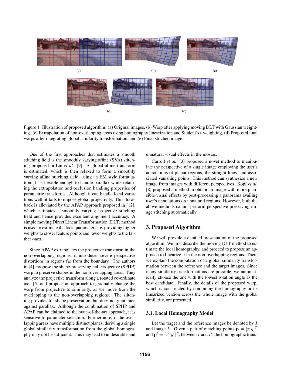我们将对我们提出的算法做一个详尽的展示。我们首先描述移动DLT算法来来估计局部单应性,接着提出一种方法来将局部单应性在非重叠区域线性化。然后再解释参考图和目标图之间的全局相似性的计算。由于可能有多种可能的相似性变换,我们自动地选择旋转角最小的相似性变换作为最优候选变换。最后,展示提出的扭曲的详情。这一扭曲是通过在整个图像上组合单应性或对应的线性化版本和全局相似性矩阵来构建的。