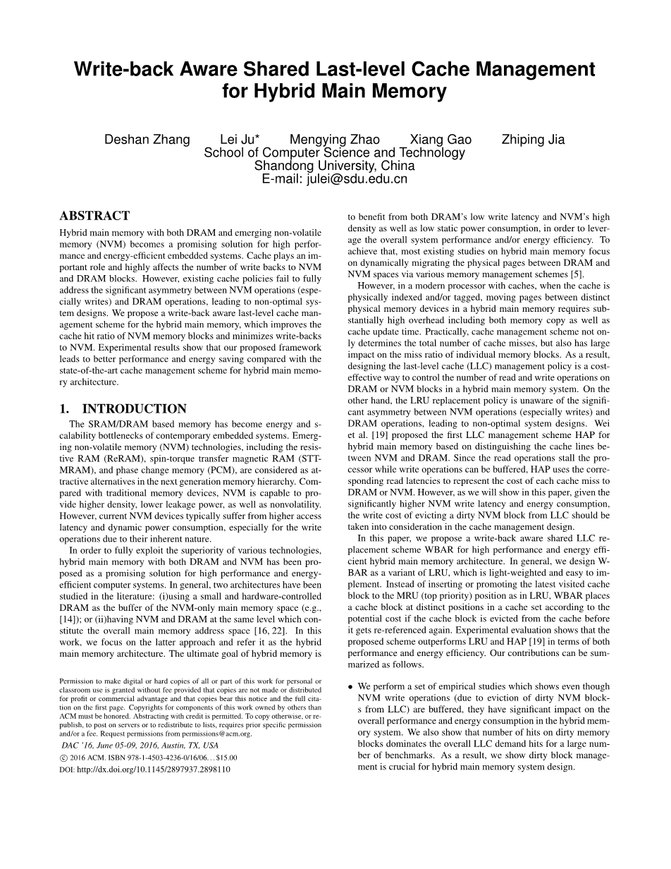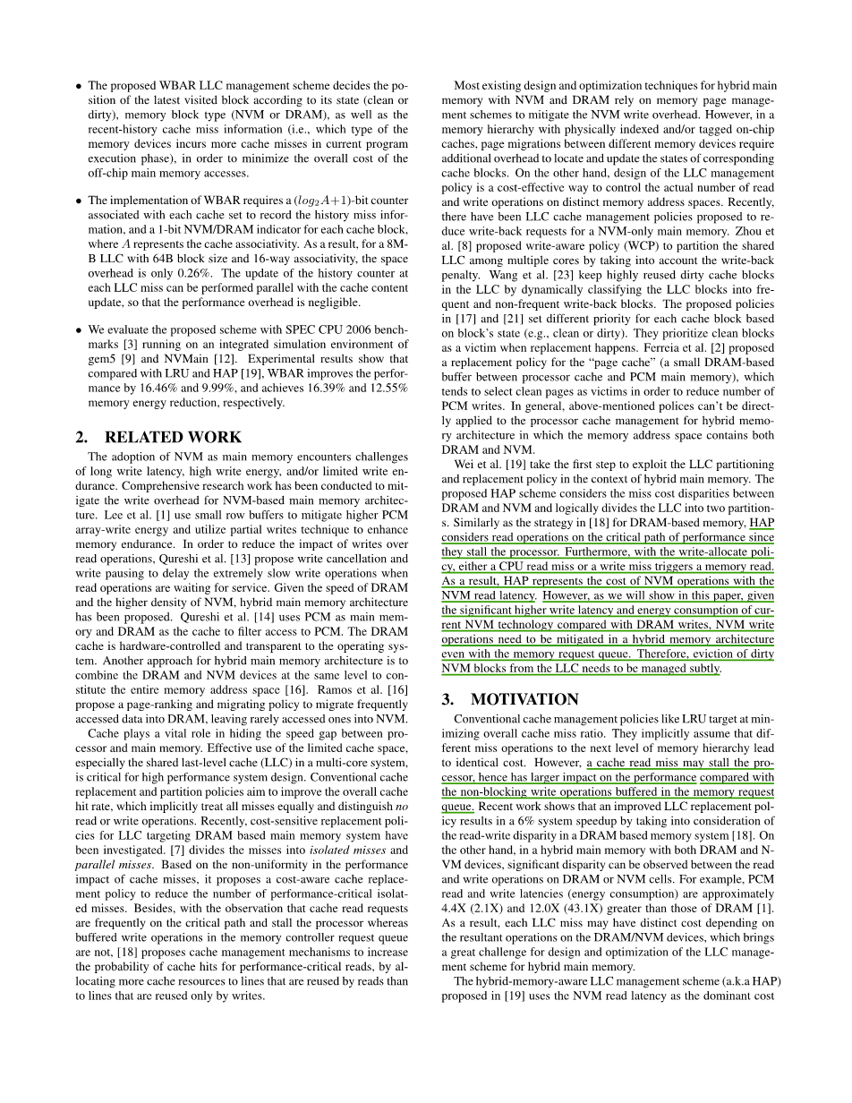bull;我们进行了一组实证研究表明,即使NVM写操作(由于从LLC中清除脏NVM块)是缓冲的,它们对混合内存系统的整体性能和能耗有显著影响。我们还表明,脏内存块上的命中数在LLC对大量基准测试的总体需求命中数中占主导地位。因此,脏块管理是混合主存系统设计的关键。