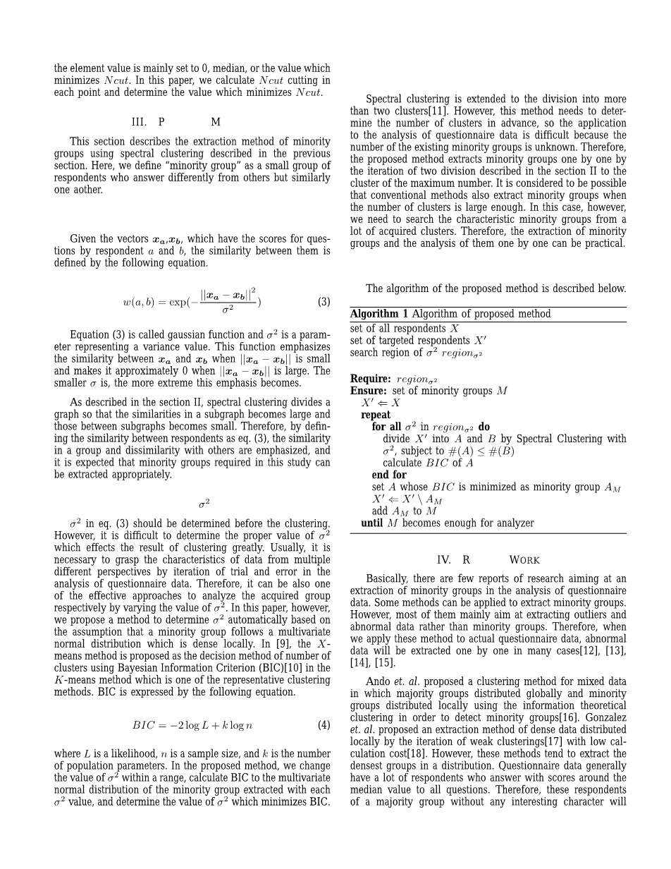 本文提出了一种基于高斯函数定义被调查者之间相似度的方法并通过迭代划分为两组,逐个提取少数群体,此外,我们还提出了一种基于贝叶斯信息准侧的呗调查者之间相似度函数参数自动确定方法。首先,通过虚拟问卷数据与传统方法的对比,初步实验表明,该方法能够较好地提取假设的少数群体。接下来,将该方法应用到书籍的问卷数据中,发现提取出了少数具有不同于平均值特征的被调查者群体。