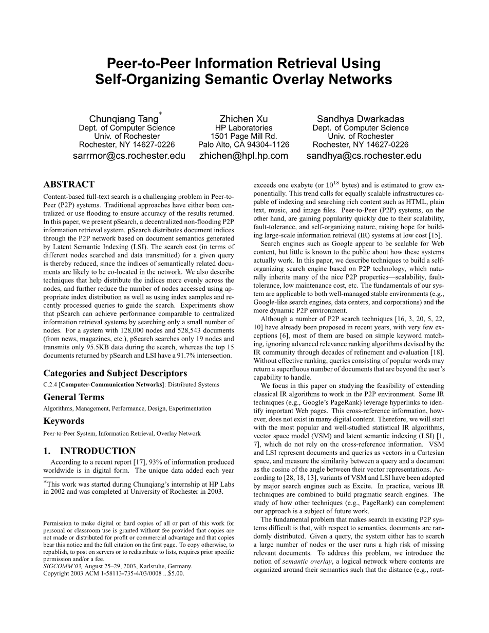基于内容的全文搜索在点对点(P2P)系统中是一个具有挑战 性的问题。传统方法要么集中,要么使用洪水来确保返回结 果的准确性。在本文中,我们提出了一个分散的非泛洪P2P信 息检索系统pSearch。pSearch基于潜在语义索引(LSI)生成 的文档语义,通过P2P网络分发文档索引。由此,减少了针对 给定查询的搜索成本(针对搜索的不同节点和发送的数据), 因为语义相关文档的索引可能共同位于网络中。我们还描述 了有助于在节点之间更均匀地分布索引的技术,并进一步减 少使用适当的索引分布访问的节点数量,以及使用索引样本 和最近处理的查询来指导搜索。实验表明,通过仅搜索少量 节点,pSearch可以实现与集中式信息检索系统相当的性能。 对于具有128,000个节点和528,543个文档(来自新闻,杂志 等)的系统,pSearch在搜索期间仅搜索19个节点并仅传输95.5KB数据,而pSearch和LSI返回的前15个文档具有91.7% 的交叉点。