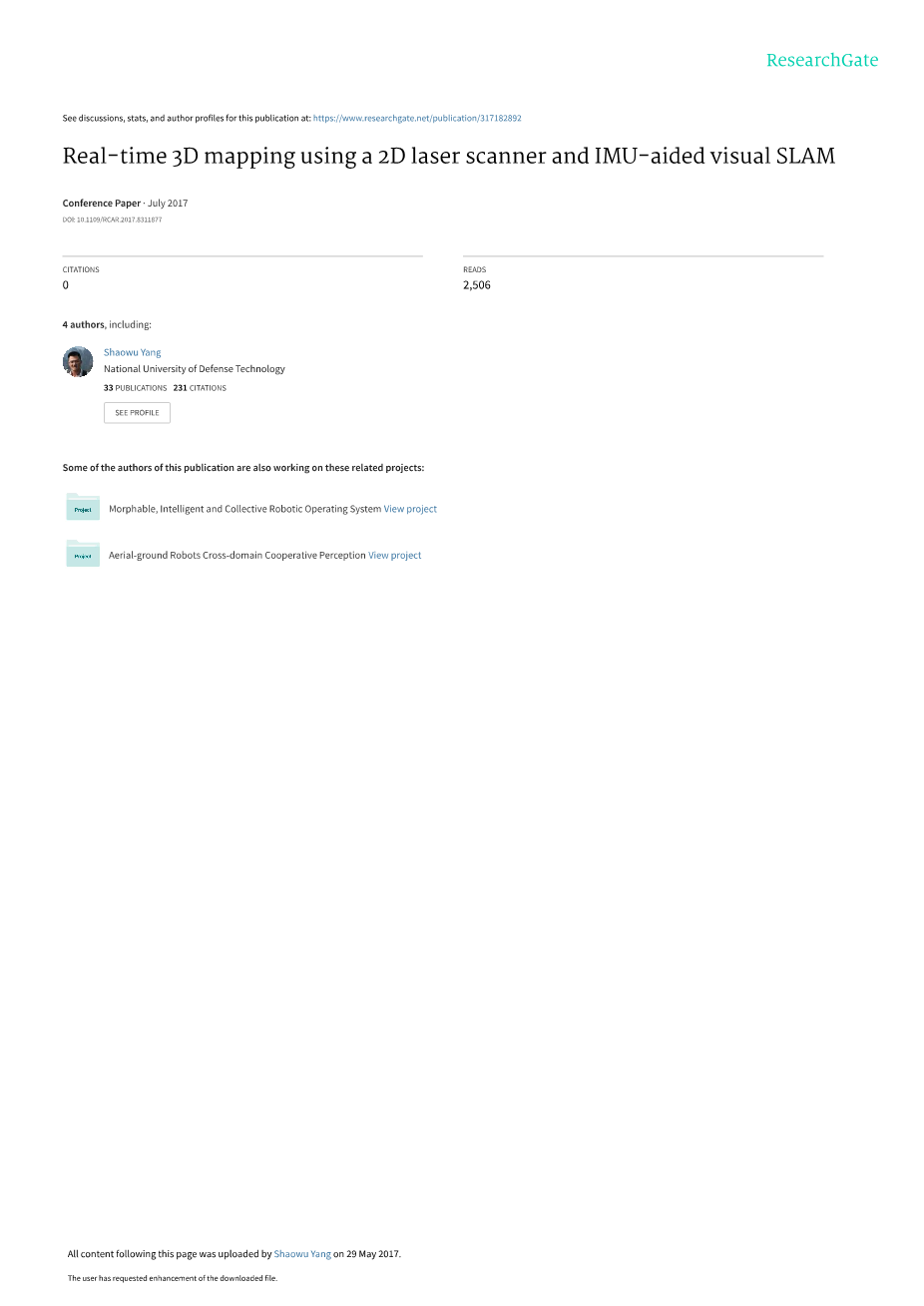 最近,大量研究人员已经尝试用2D扫描仪来构图,认为他们时轻量的,相对便宜的,并且能够在一个广阔的环境状况下提供2D范围数据[6]。为了收集3D的点,一个典型方法是增加更多的扫描仪在一个移动平台。两个2D扫描仪被用时,虽然这个水平安装的建立了2D地图来恢复位置,并且这个竖直安装的的来扫描竖直方向的,这样来转换成点云数据。因为这个方法需要非常精确的运动判断并且不适应3维状况,研究人员尝试用一个旋转的2D扫描仪由马达驱使[3][4]。连续的旋转使2D扫描仪有大量的视野,然而,这导致了需要用复杂的机械配置。