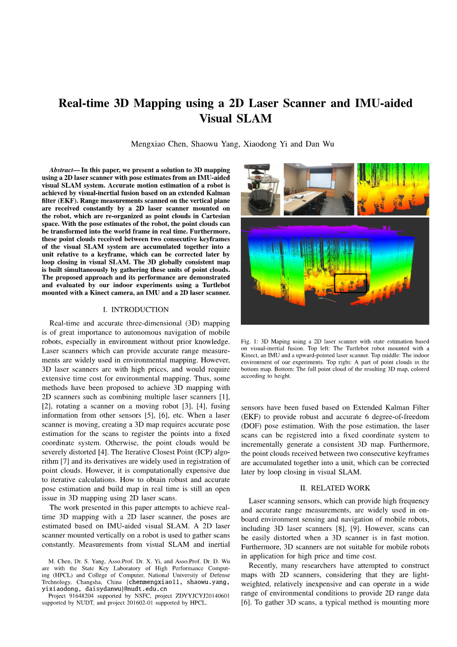 实时和精确的3D建图是核心对于移动机器人的自动导航,尤其在没有先前知识的情况下。提供精确测距的激光扫描仪被广泛用在环境建图上。然而,高价的3D激光扫描仪要求大量的时间对于环境建图。因此,一些方法被推荐对于实现3D建图通过2D激光扫描仪[1],[2],像多个激光扫描仪的组合、在一个移动机器人上[3][4]旋转扫描仪、融合多个传感器的信息[5],[6]等。当激光扫描仪移动时,创建一个3D地图要求精确的位姿判断,以便在一个固定的坐标系中记录这些点。否则,这些点云数据被严重扭曲[4]。这个最近迭代点算法(ICP)[7]和它的派生法被广泛应用在点云数据的记录上。然而,由于重复的计算,使得计算复杂度非常大。怎样获得稳健、精确的位置判断,并能够实时建图仍然是一个有待解决的问题对于用2D激光扫描仪来完成3D建图。