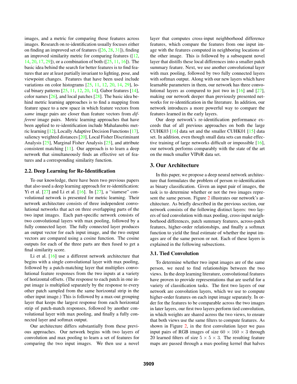 此次工作中,我们提出了一种特征学习和相似性度量同步进行的行人重识别方法。我们提出了一种深层卷积架构,其中部分隐藏层专门用于解决重识别问题。给定一对图像组作为输入,输出两对图像相似度值,以此指明两个输入图像组是否为同一人。我们架构的新元素包括一个计算交叉输入邻域差异的层,它根据每个输入图像的中间特征捕获两个输入图像之间的局部关系。当前层输出的高级特征摘要由上一层区域特征计算得到,这些高级特征结果在之后的网络层进行集成。我们的方法在大数据集(CUHK03)和中型数据集(CUHK01)上的测试结果明显优于现有技术,且过拟合度低。我们还证明,通过在对小型目标数据集进行微调之前使用大数据集进行初试训练,即使在小型数据集(VIPeR)上,我们的网络也可以获得与现有技术相媲美的结果。
