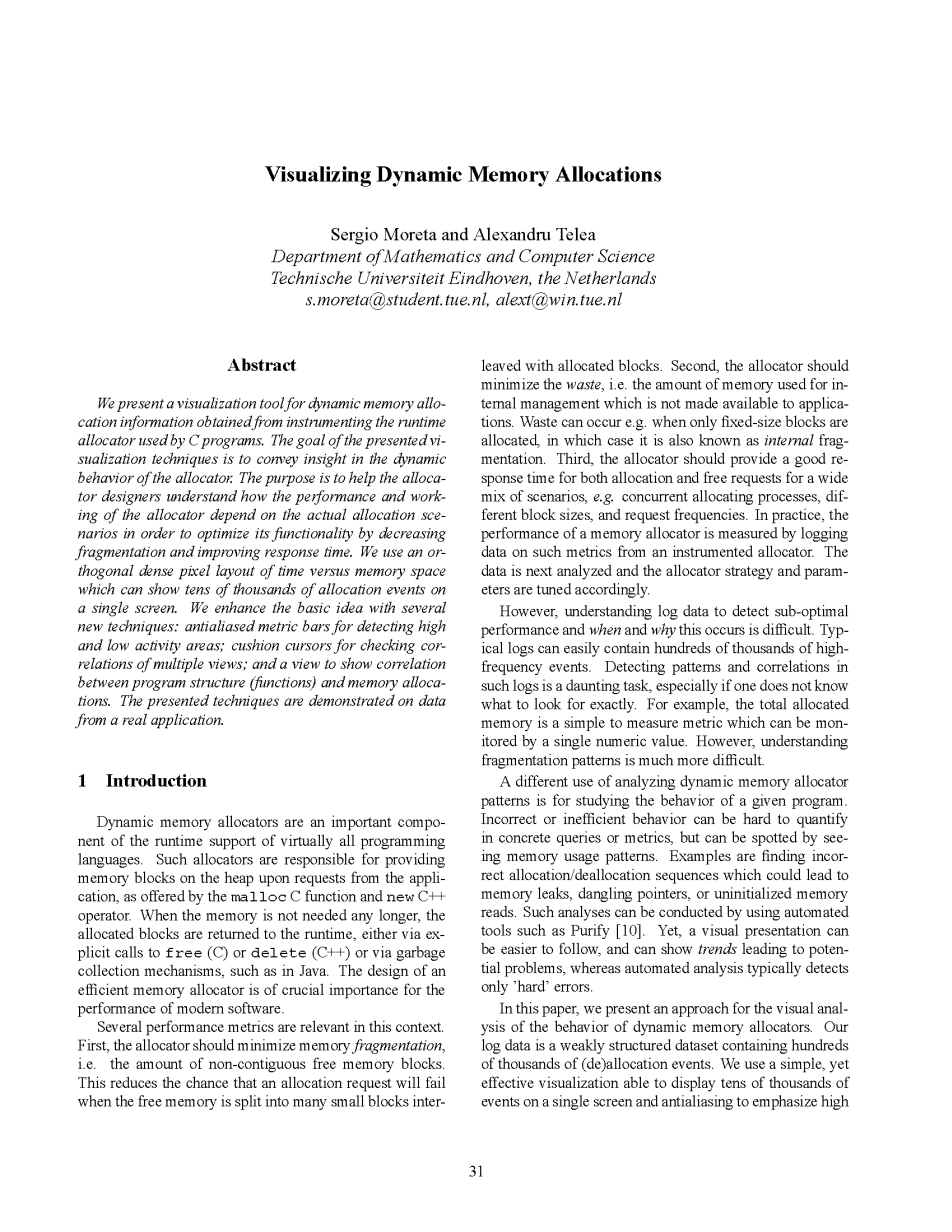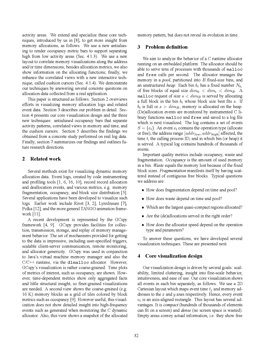 我们提供了一个用于监测从C语言程序所使用的运行时分配器中获得动态内存分配信息的可视化工具。这个可视化技术的目标是监测分配器的动态行为。目的是帮助分配器设计者理解分配器的性能和工作如何依赖于实际的分配方案,以便通过减少碎片来优化其功能并改善响应时间。我们使用时间与内存空间的正交密集像素布局,可在单个屏幕上显示数万个分配事件。我们通过几种新技术增强了基本思想:用于检测高活动区域和低活动区域的抗锯齿公制条;缓冲光标,用于检查多个视图的相关性;显示程序结构(函数)和内存分配之间的相关性的视图。所呈现的技术在实际应用的数据上得到了证明。