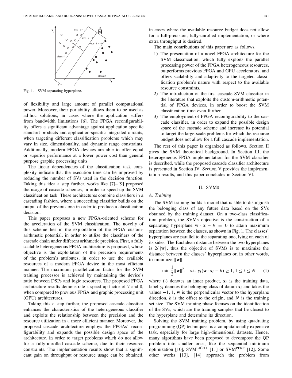 本文的其余部分安排如下。第二部分给出了SVM的理论背景。在第三节中,描述了用于SVM分类器的异构FPGA实现,而在第四节中提出了所提出的级联分类器体系结构。第五部分提供了实施结果,本文在第六部分总结。