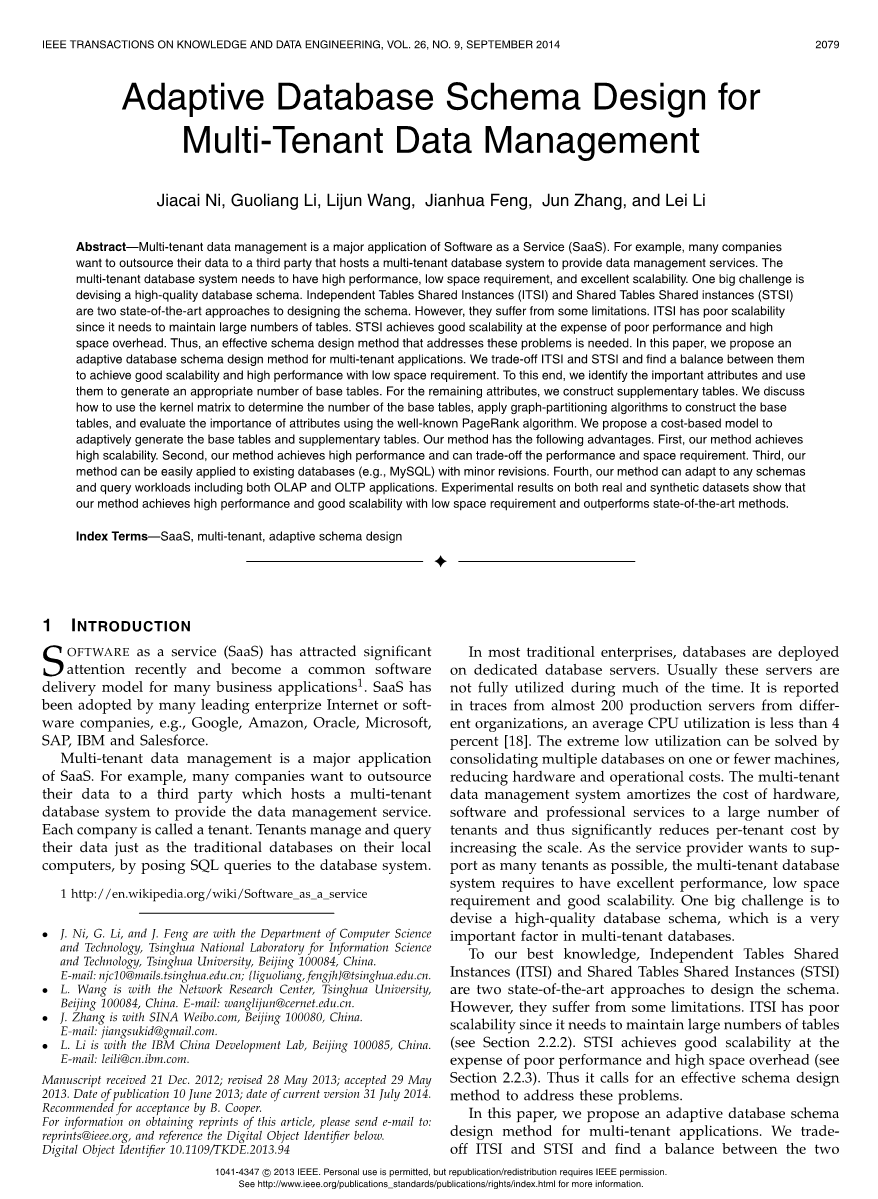 多用户数据管理是软件即服务(SaaS)的主要应用。例如,许多公司希望将其数据外包给第三方,该第三方托管多用户数据库系统以提供数据管理服务。多用户数据库系统需要具有高性能,低空间需求和卓越的可扩展性。一个巨大的挑战是设计高质量的数据库模式。独立表共享实例(ITSI)和共享表共享实例(STSI)是设计模式的两种最先进的方法。但是,它们受到一些限制。由于需要维护大量表格,ITSI的可扩展性差。 STSI以牺牲性能和高空间开销为代价实现了良好的可扩展性。因此,需要一种解决这些问题的有效架构模式设计方法。在本文中,我们提出了一种适用于多用户应用的自适应数据库架构模式设计方法。我们权衡ITSI和STSI,并在它们之间找到平衡点,以在低空间要求下实现良好的可扩展性和高性能。为此,我们确定重要的属性并使用它们来生成适当数量的基表。对于其余属性,我们构造补充表。我们讨论如何使用核心矩阵来确定基表的数量,应用图分区算法来构建基表,并使用众所周知的PageRank算法评估属性的重要性。我们提出了一个基于成本的模型来自适应生成基表和补充表。我们的方法具有以下优点。首先,我们的方法实现了高可扩展性。其次,我们的方法实现了高性能,并且可以权衡性能和空间要求。第三,我们的方法只需稍作修改就可以很容易地应用到现有的数据库(例如MySQL)。第四,我们的方法可以适应任何模式和查询工作负载,包括OLAP和OLTP应用程序。对真实和合成数据集的实验结果表明,我们的方法在空间要求低的情况下实现了高性能和良好的可扩展性,并且胜过了最先进的方法。