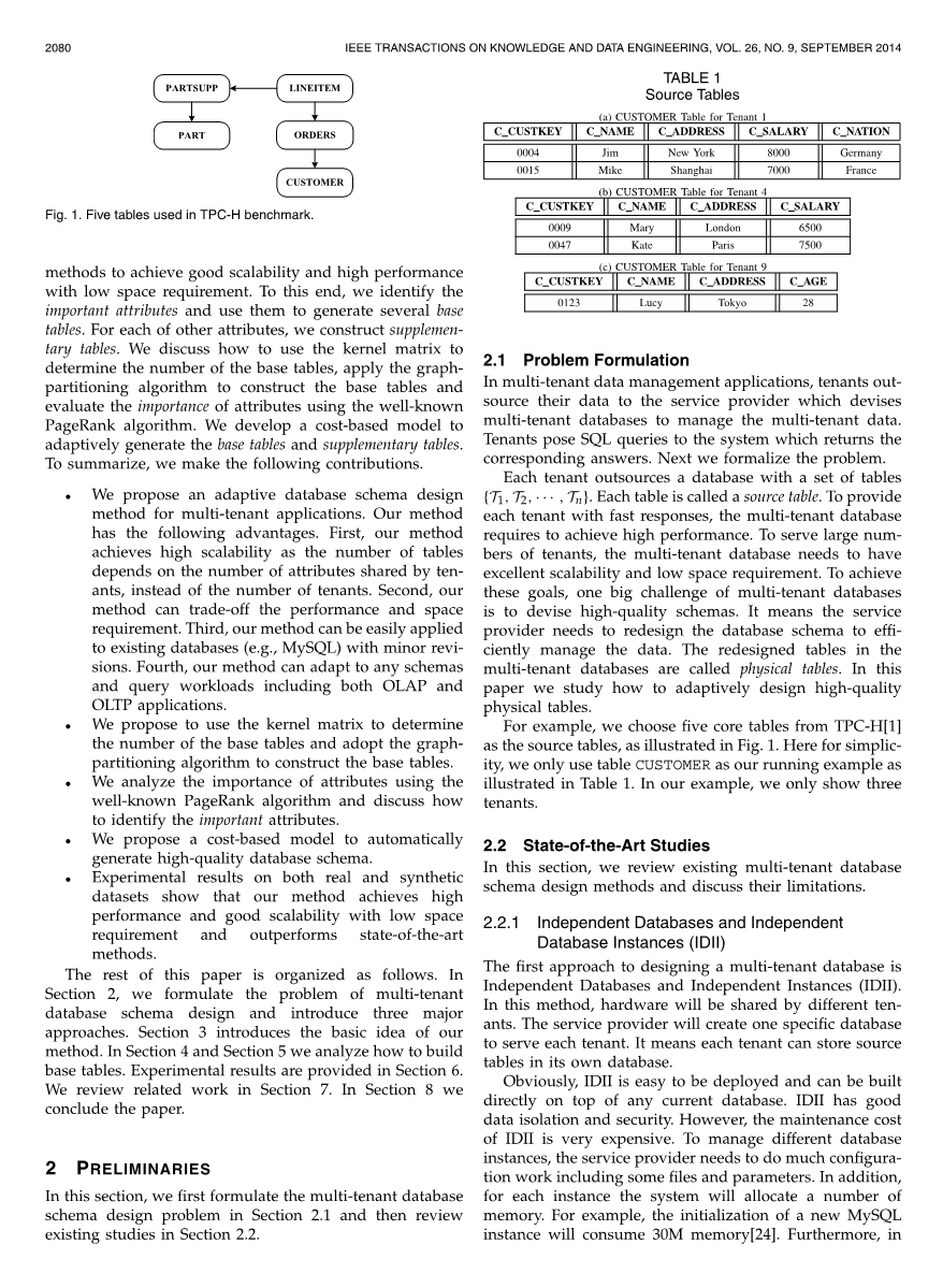 例如,我们从TPC-H [1]中选择五个核心表作为源表,如图1所示。这里为了简单起见,我们只使用表CUSTOMER作为我们的运行示例,如表1所示。在我们的例子中,我们只显示三个租户。