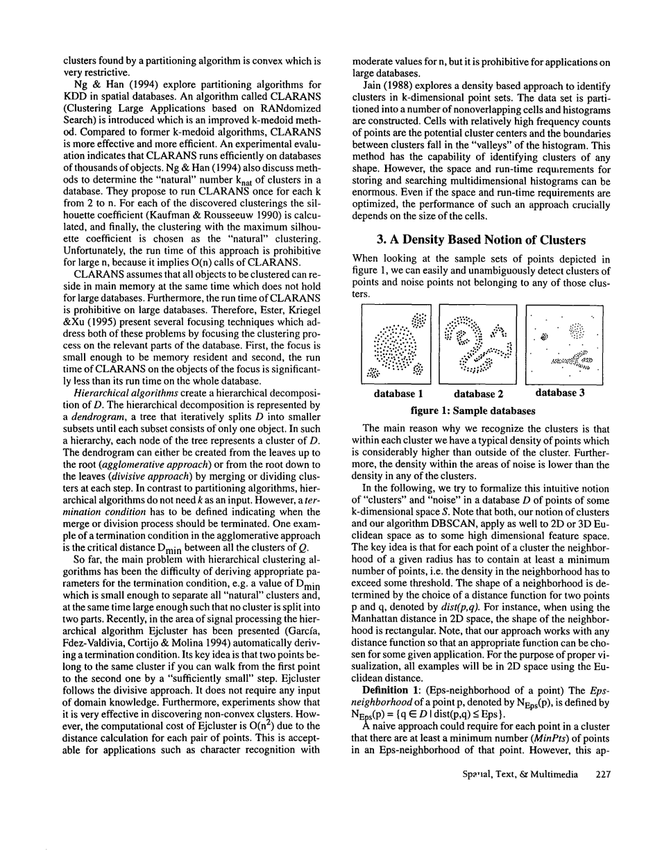 数据库中知识发现的几项任务(KDD)已在文献中定义(Matheus,Chan&Pi-atetsky-Shapiro 1993)。本文考虑的任务是类识别,即将数据库的对象分组为有意义的子类。例如,在地球观测数据库中,我们可能想要发现沿着某条河流的房屋类别。