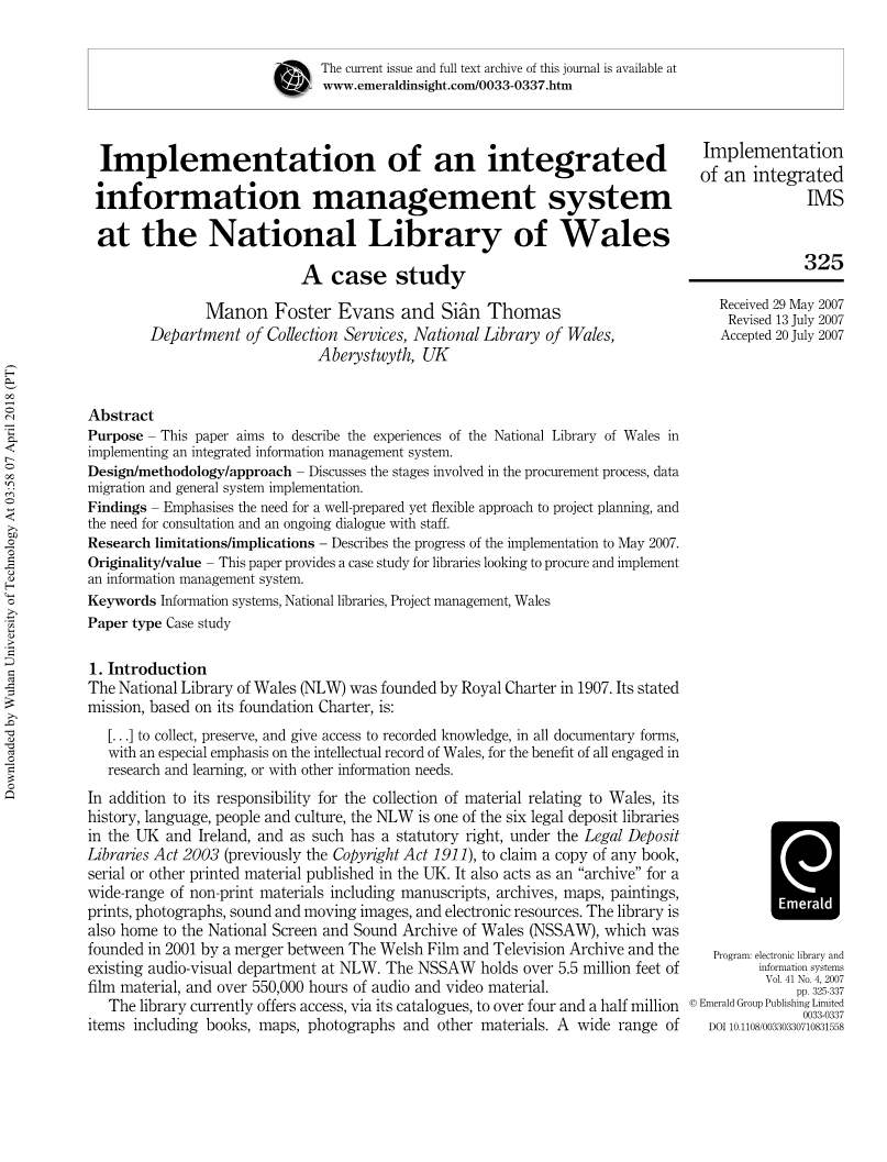 目的 - 本文旨在描述威尔士国家图书馆实施综合信息管理系统的经验。