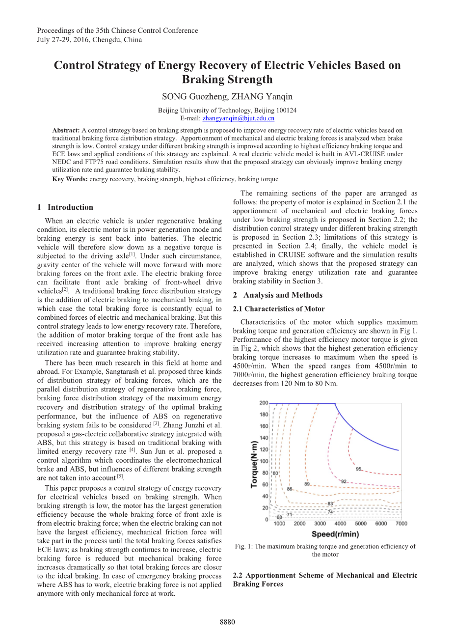 因此,这篇论文提出了一种基于制动强度的电动汽车能量回收控制策略。该策略的基本原理是:当制动力较低时,由于前轴的整体制动力均来自电力制动力,电动机的发电效率将会达到最大;此外,当电力制动不能达到最大效率时,在总制动力满足欧洲经济委员会(ECE)路况条件之前,机械摩擦力将会参与该制动过程;并且随着制动力的持续增长,电力制动力会逐渐降低,机械制动力会大幅度提高,以便总制动力接近理想制动力。然而,在防抱死制动系(ABS)必须工作的紧急制动过程中,电动制动力将不再适用。因此,在这种制动过程中,只有机械制动力还处在工作状态下。