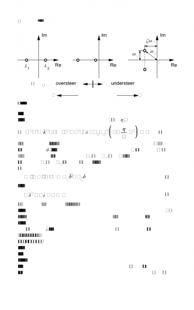 如图1.12所示方程式1.67的根lambda;可能会在水平坐标面上有相应的轨迹。在数值为正的角刚度的条件下,只有在特征方程的最后一项系数可以为负,这也是特征值类型有限的原因。我们将会在1.3.3节中看到,在低于非线性车轴特征峰值下的可能的负斜率可能会引起其他形式的不稳定运动,且该类运动会与两个正实数根或两个共享实数部分的共轭复数。对于线性车辆模型,在转向过度的情况下我们会有2个实数根,而在转向不足时,则会由一堆复数根。注意,在车辆低速状态下,转向不足的车辆,也可能会有一堆负实数根。