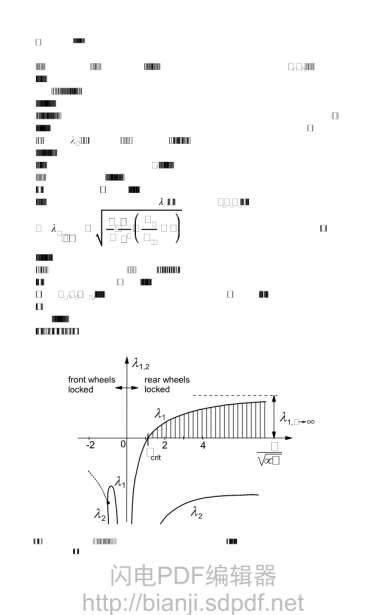 鉴于上述后桥锁死汽车失稳的临界速度之低(正常行驶时制动刹车时的速度将远大于这一速度),将不稳定的程度考虑为速度的函数将更有实际意义。这里采用一根lambda;1代表不稳定的等级。图3.42描述了lambda;1随着行驶速度变化的趋势。这一图表包括了前轮锁死的情况,此时很显然这一根取负值,并在高行驶速度下变得复杂(实部用虚线曲线表示)。为表达不稳定程度的实际情况,我们采用u趋近于无穷时的水平渐近线。