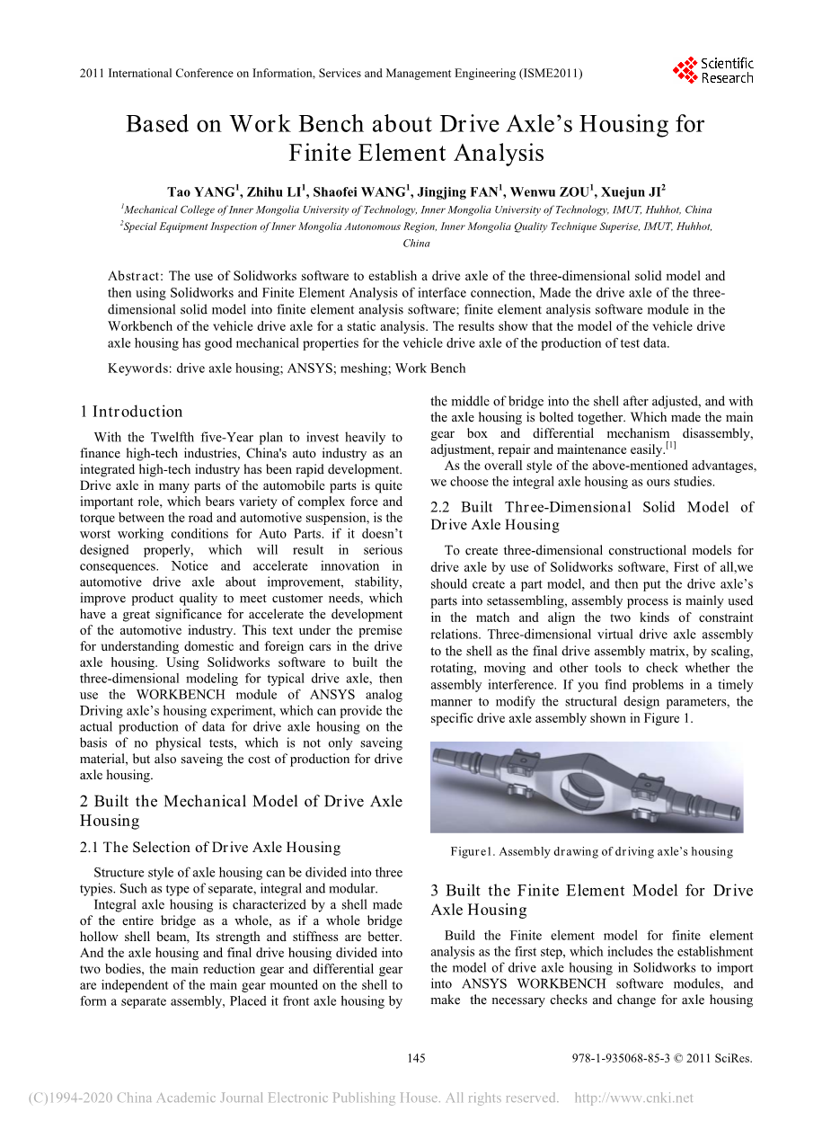 摘要:利用Solidworks软件建立驱动桥的三维实体模型,然后利用Solidworks与有限元分析的接口连接,将驱动桥的三维实体模型置入有限元分析软件;在有限元分析软件模块Workbench上对汽车驱动桥进行静态分析。结果表明,所建立的汽车驱动桥壳模型具有良好的力学性能,为汽车驱动桥的生产提供了试验数据。