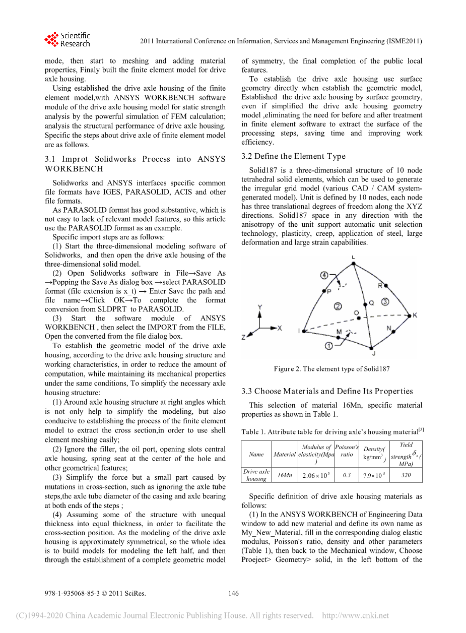 首先建立有限元模型进行有限元分析,其中包括建立Solidworks 驱动桥壳体模型,导入ANSYS WORKBENCH软件模块,对驱动桥壳体进行必要的校核和更换模态,然后开始网格化和添加材料特性,最后建立了驱动桥壳的有限元模型。
