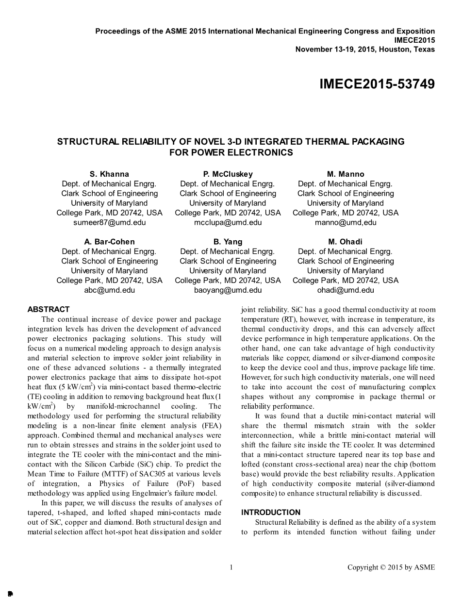 器件功率和封装集成水平的不断提高推动了先进电力电子封装解决方案的发展。本研究将集中在设计分析的数值模拟方法和材料的选择来提高焊点可靠性的这些先进的解决方案——一个热集成电力电子方案,旨在消除热点热通量(5 kW / cm2)通过基于mini-contact热电(TE)冷却除了删除背景热通量(1千瓦/ cm2) manifold-microchannel冷却。用于结构可靠性建模的方法是非线性有限元分析(FEA)方法。采用热分析和力学分析相结合的方法,获得了用于集成TE冷却器与微型接触器和与碳化硅(SiC)芯片的微型接触器的焊点的应力和应变。为了预测SAC305在不同集成级别上的平均失效时间(MTTF),使用了基于失效物理(PoF)的方法,使用的是Engelmaier失效模型。